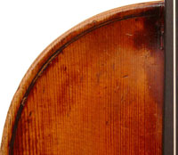 Excellent. No cracks or discernable repairs in the top or bottom. A minor crack in the front edge of the button can be repaired. The varnish is worn, but is original and not retouched. Note that the line in the back at the soundpost position is a scratch and not a crack. The edges and two corners on the treble side of the top is somewhat worn.