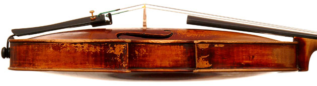 The dark brown varnish is well-worn, exposing a yellow ground - not unappealing in all its wear. The violin is full of character marks and wear patterns in the varnish, all merely superficial and with no structural implications.