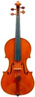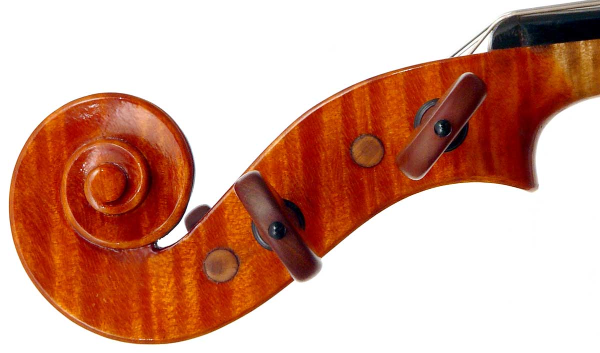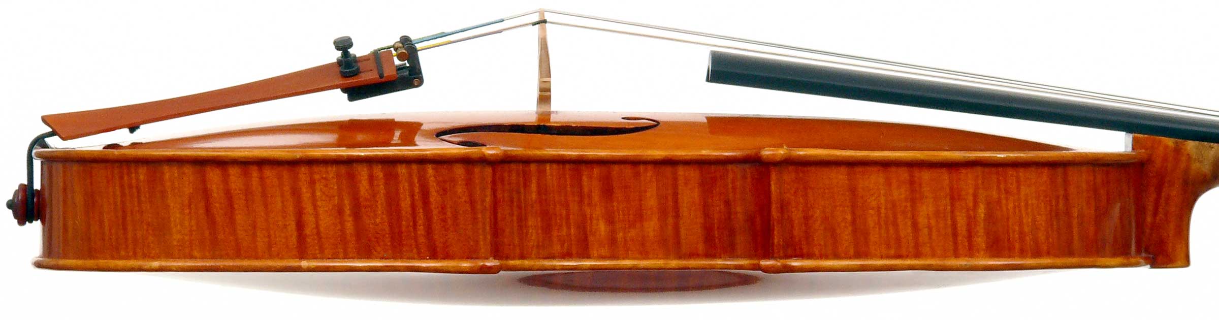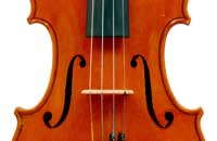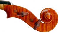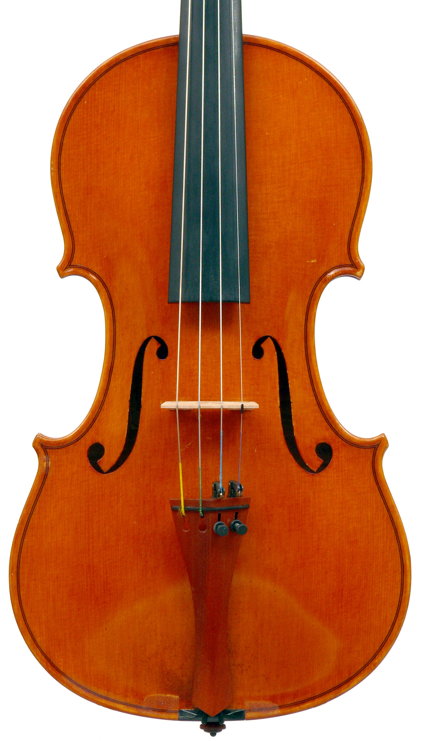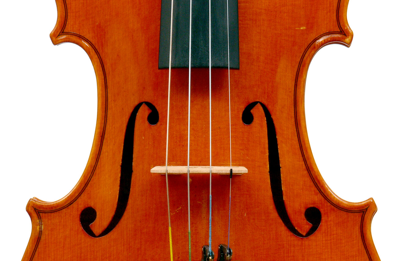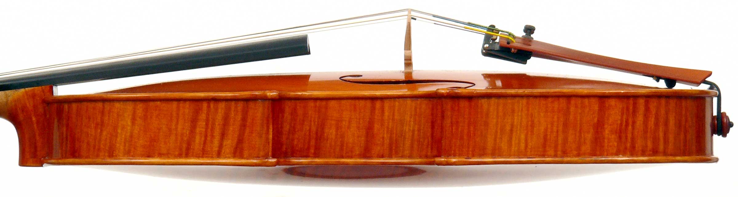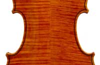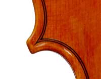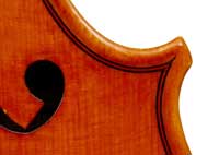 This violin has a particularly attractive back of richly flamed maple with a medium curl - the ribs, neck and scroll appear to be of the same well figured wood. Throughout the craftsmanship is refined and of a high order, particularly noticeable in the crisp tracing of purfling and tidy mitre work in the corners. It appears that it loosely follows the Guarneri model, at least as far as the f-holes are concerned.