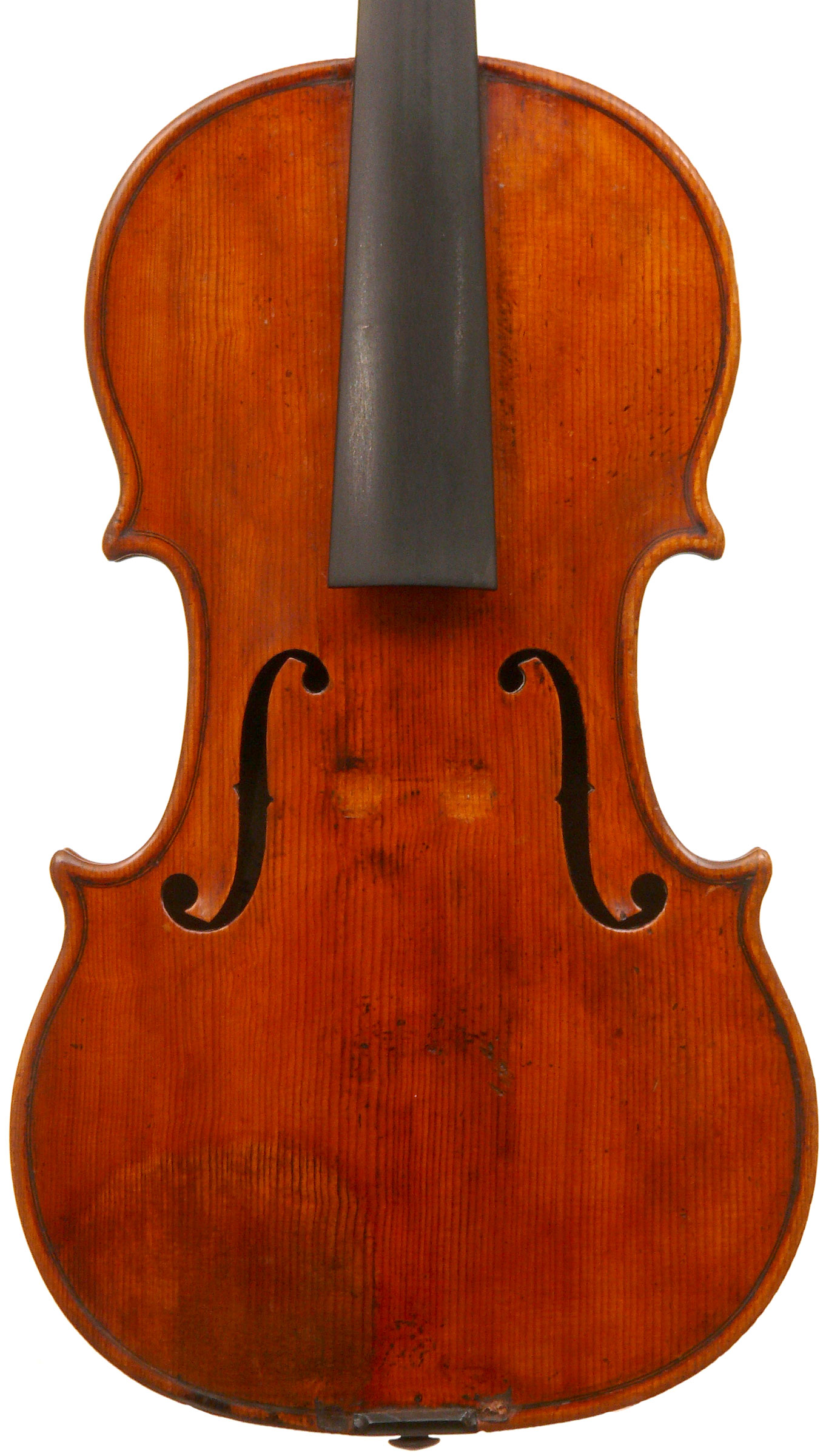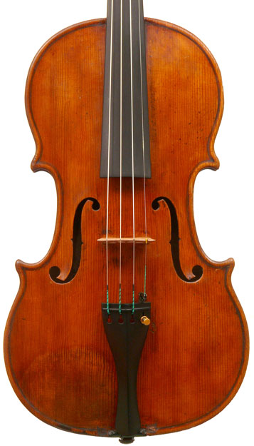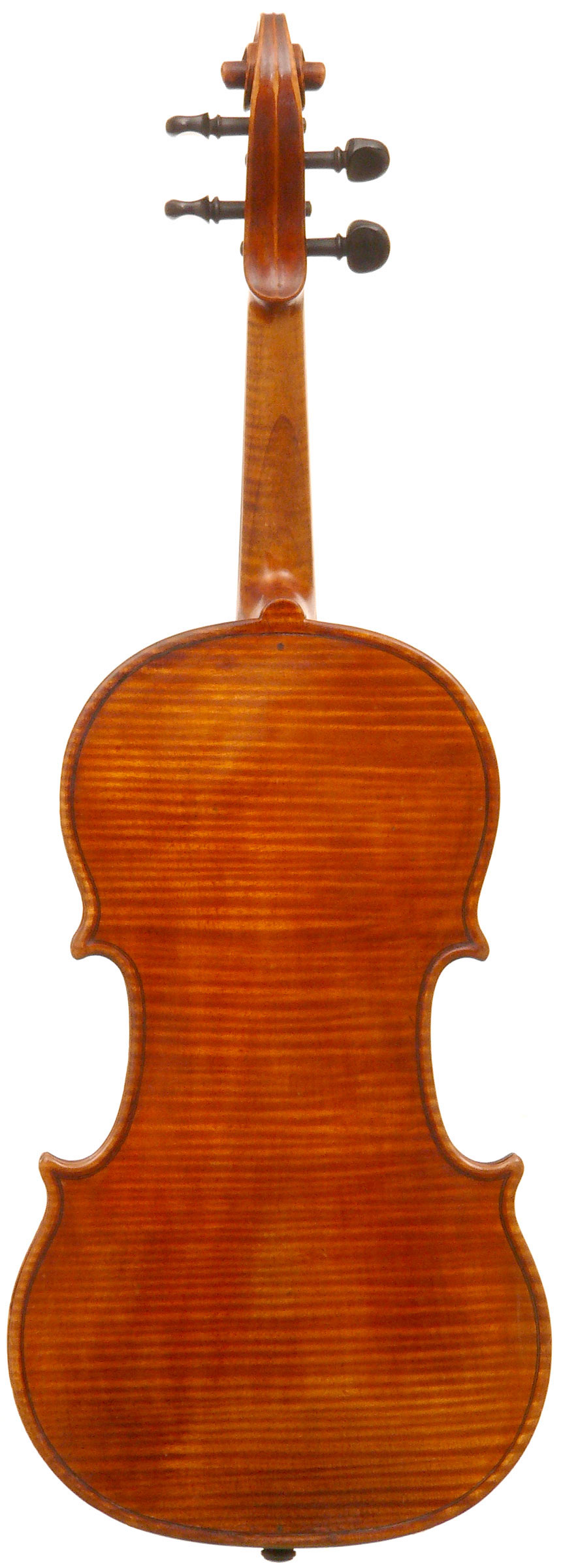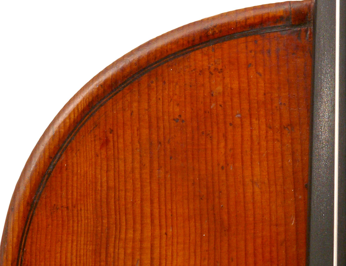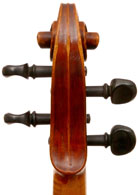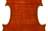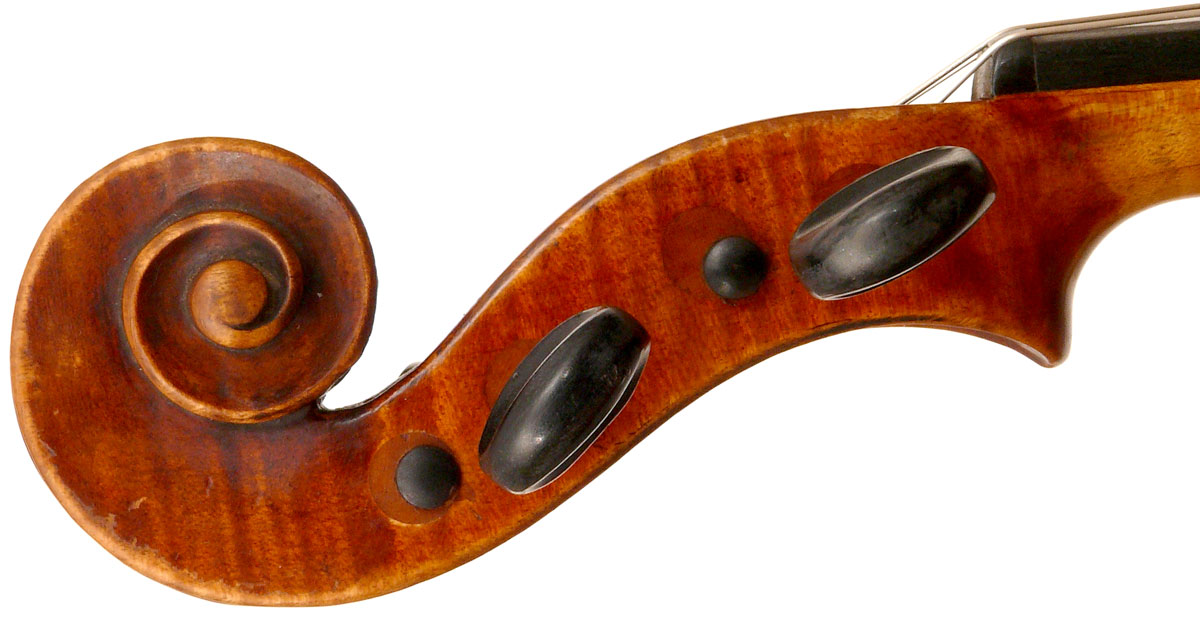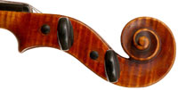 What strikes one in this violin is the beautiful one-piece back of nicely flamed maple with a distinct narrow curl running straight across the back. The edges are strong and the corners rounded and soft, rather than angular. The purfling is very well-traced. The scroll is really splendid, beautifully refined, strong and superbly balanced - the work of a master craftsman. There is no neck-graft and all the pegholes are bushed.