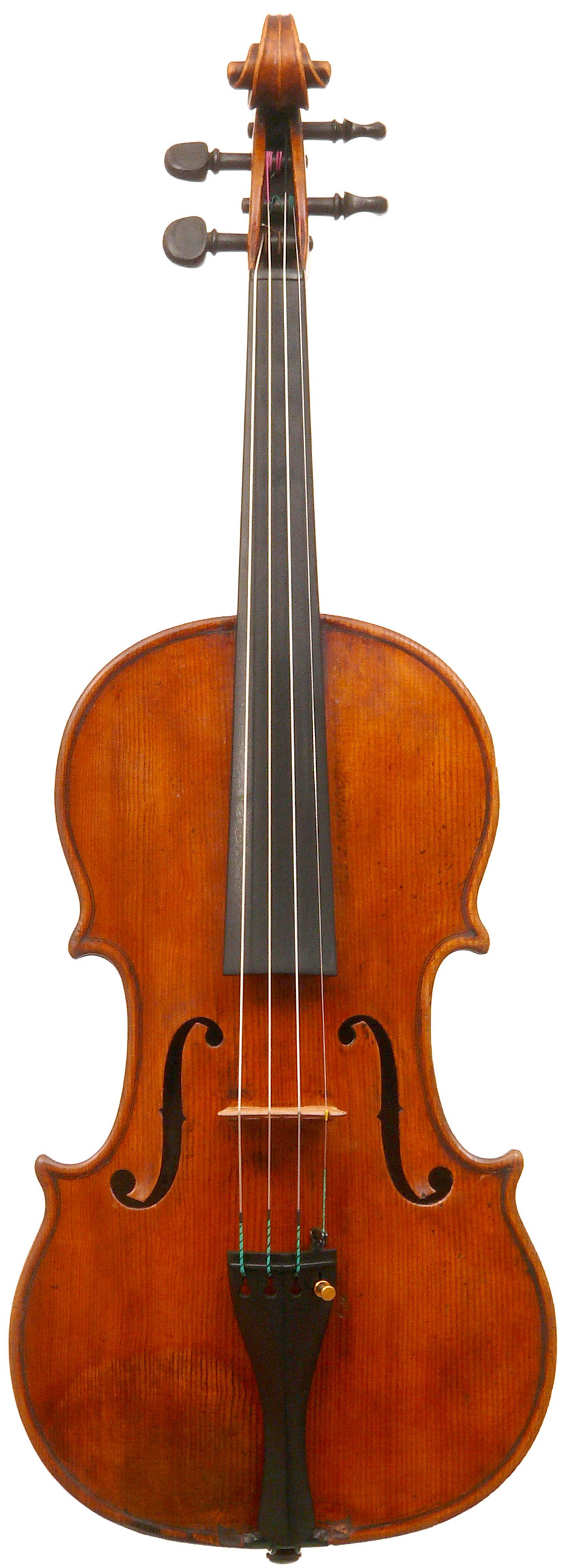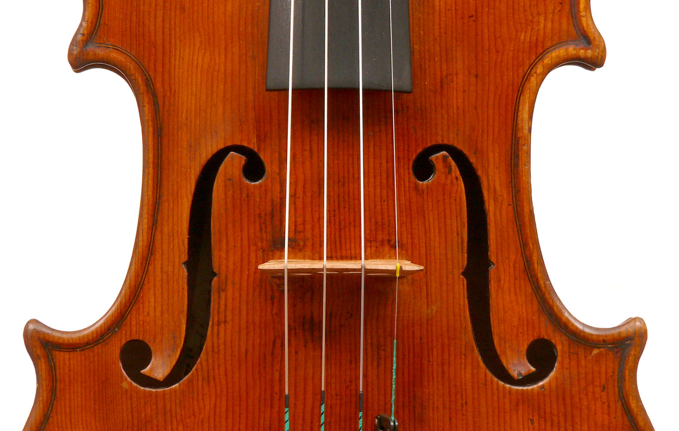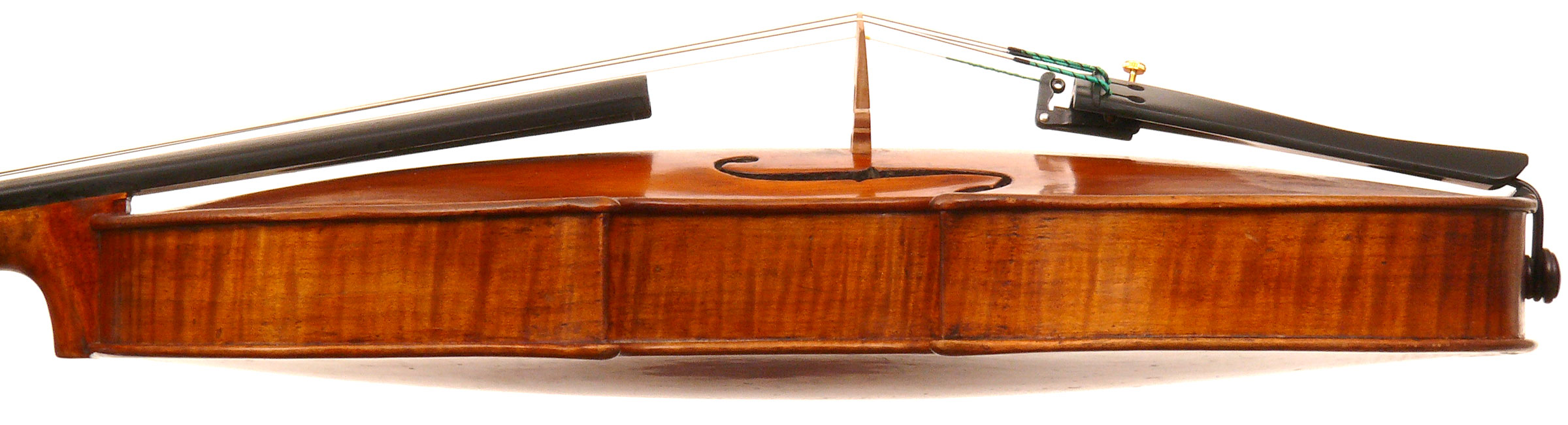 What strikes one in this violin is the beautiful one-piece back of nicely flamed maple with a distinct narrow curl running straight across the back. The edges are strong and the corners rounded and soft, rather than angular. The purfling is very well-traced. The scroll is really splendid, beautifully refined, strong and superbly balanced - the work of a master craftsman. There is no neck-graft and all the pegholes are bushed.