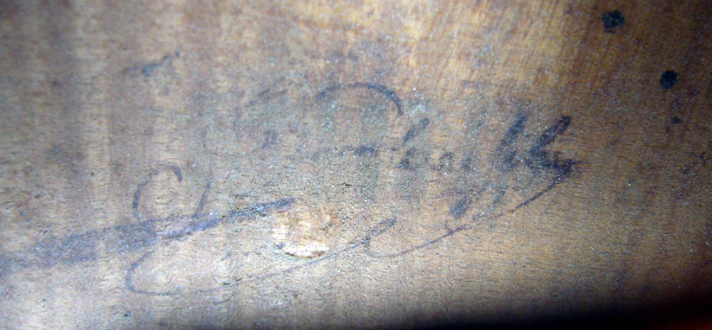 A closer look at the identifiers in this violin underlines the fact that Joseph Nicolas' work is almost identical to that of his more illustrious and respected father, Didier Nicolas (1757 - 1833). The son succeeded his father around 1816. Whereas Vannes indicates that the son always branded his instruments, this violin bears no brand anywhere. However, what removes all doubt that this violin is the work of Joseph Nicolas Fils, is that it bears his known signature in ink in the back, next to the soundpost (see photo).