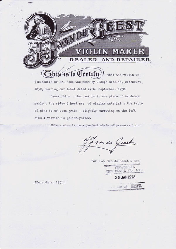 The Dutch violin maker and authority, J. J. van de Geest (1899 - 1974), identified this violin as the work of Joseph Nicolas Fils (1796 - 1864) from Mirecourt, made in 1830. Van de Geest was certainly qualified to make such an assertion, having been studio manager for George Hart & Son in London for 18 years until 1938, a period during which he established his reputation internationally as maker, restorer and authority on old instruments. The violin currently bears a 1950 handwritten label by Van de Geest giving the above attribution. A later accompanying certificate, dated 1952, affirms Van de Geest's attribution to Joseph Nicolas Fils.
