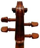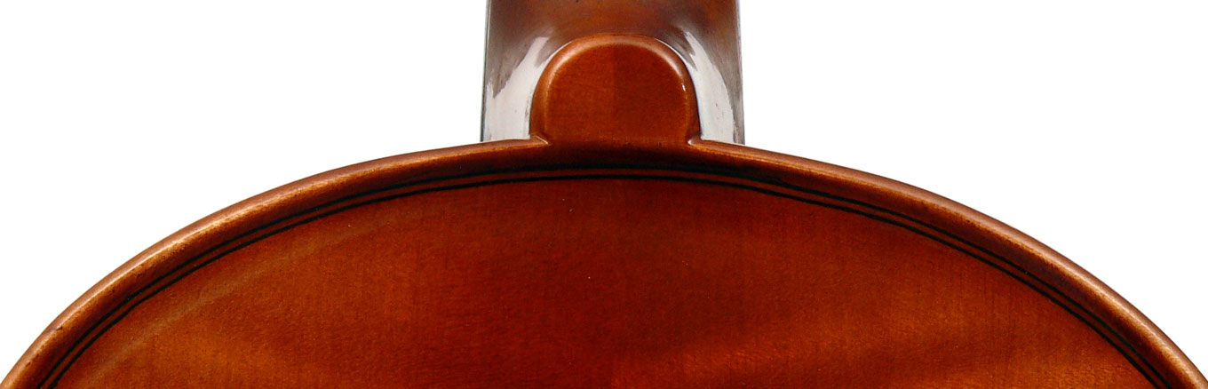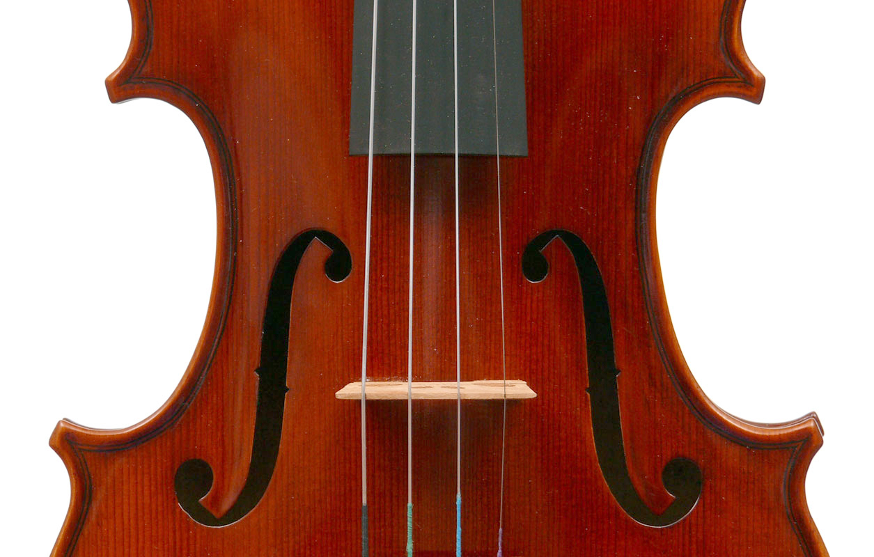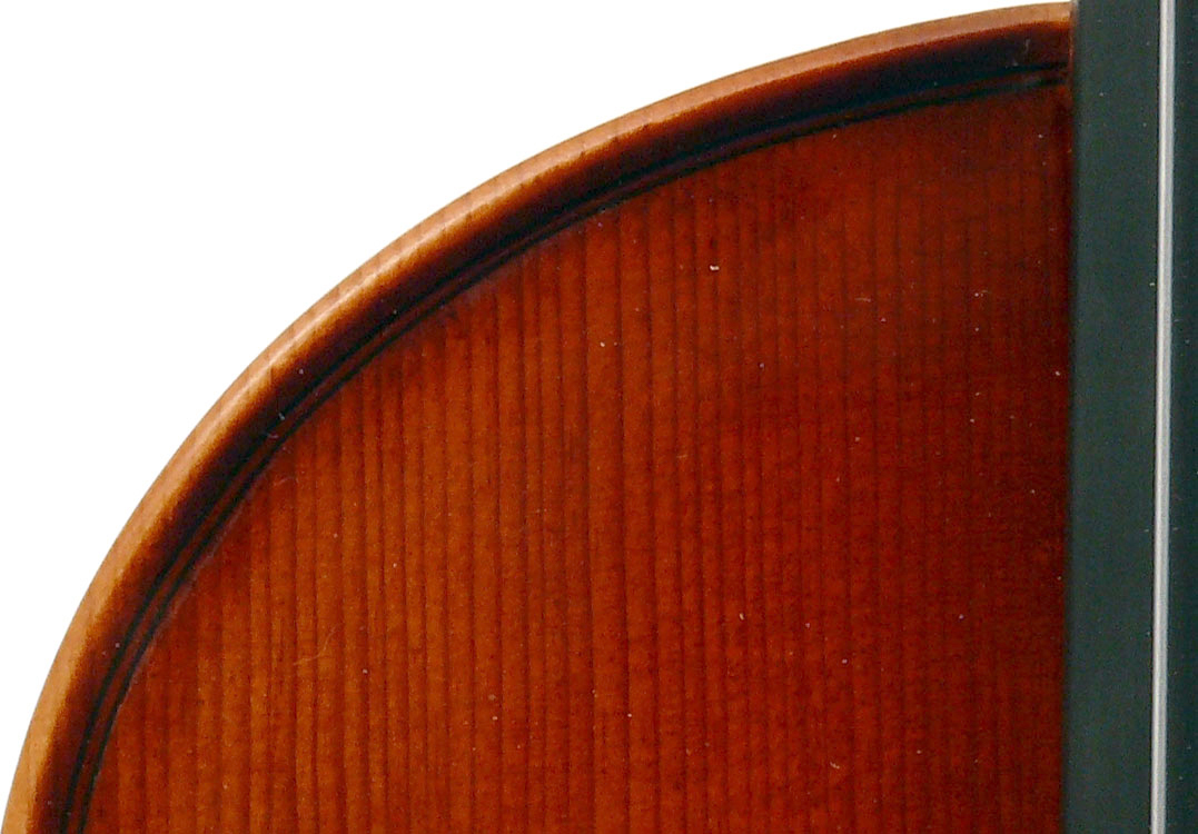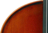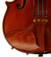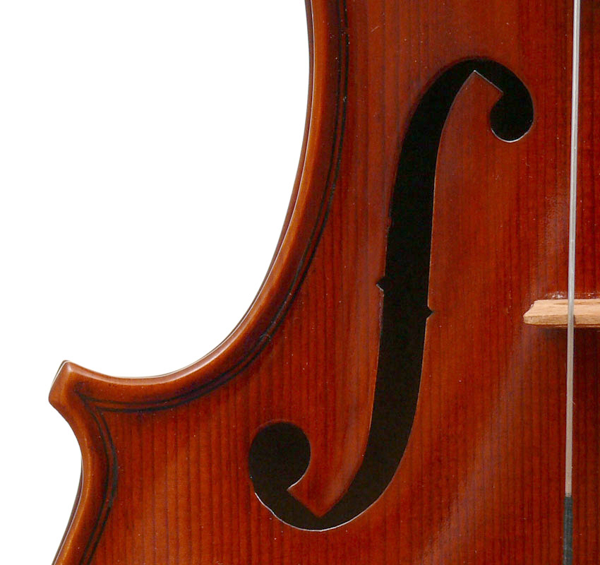 The materials are well chosen - the two-piece back and sides are consistently of good quality maple. The top is of good tone spruce, always with a clear attractive straight medium grain. It is the tidy work in the corner mitres, the neatly traced purfling and attention to detail in the f-holes that show the serious intent behind these instruments. No shortcuts are taken - for example, the insides are correctly crafted, fully blocked and lined with a fitted bass bar. The bridge is by Despiaux - a top French brand. The Guarneri-type chinrest and pegs are of a very attractive rosewood. The tailpiece has been replaced since these photos were taken and is now of a black student type with built-in bronze adjusters.