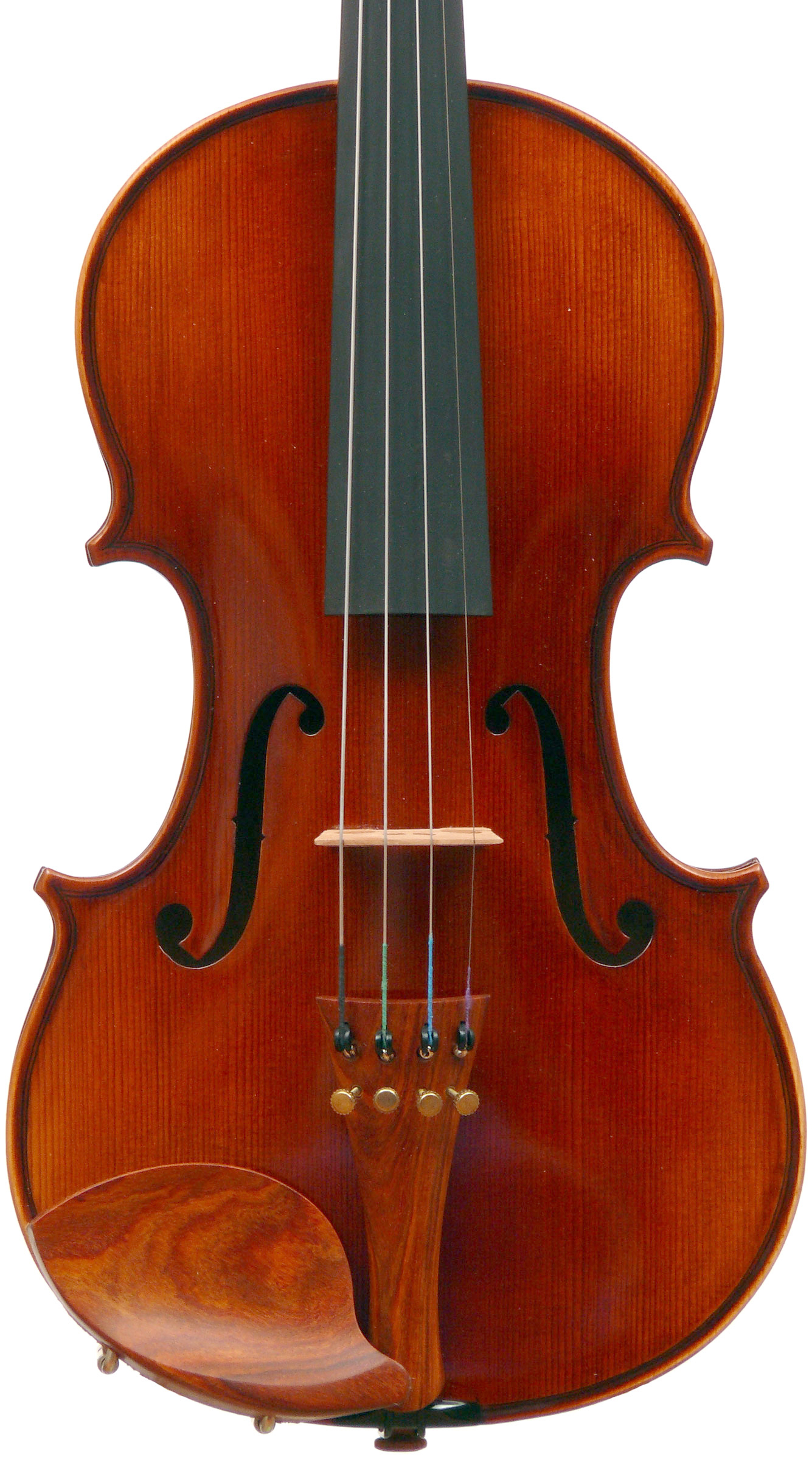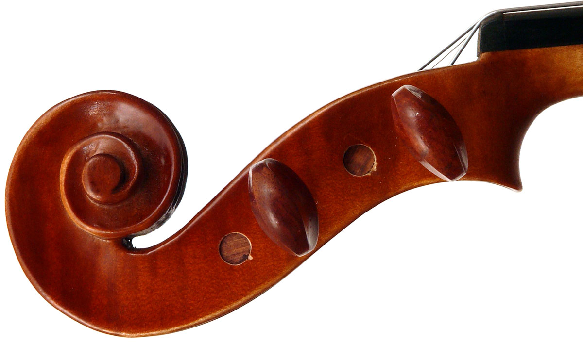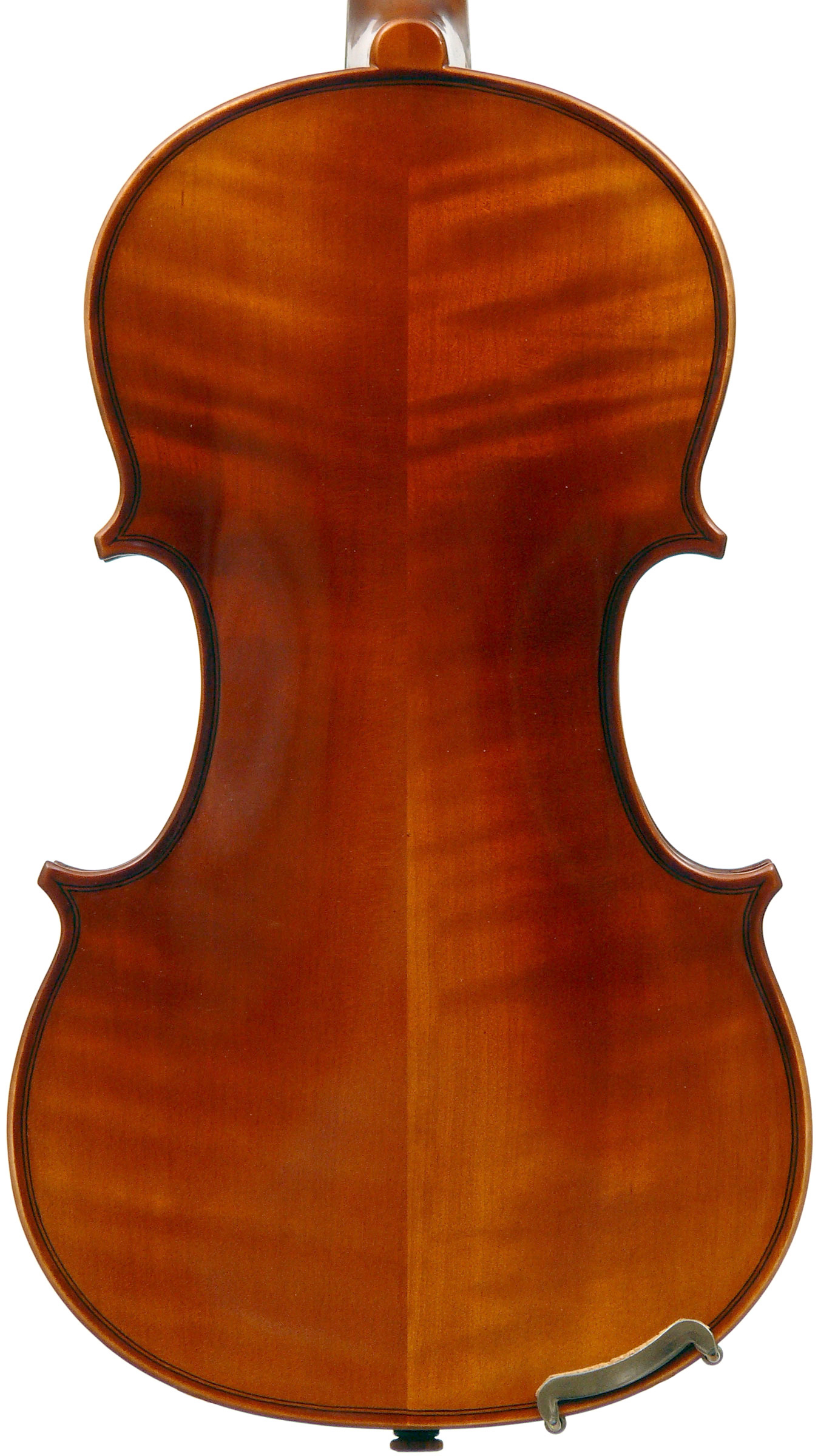 The materials are well chosen - the two-piece back and sides are consistently of good quality maple. The top is of good tone spruce, always with a clear attractive straight medium grain. It is the tidy work in the corner mitres, the neatly traced purfling and attention to detail in the f-holes that show the serious intent behind these instruments. No shortcuts are taken - for example, the insides are correctly crafted, fully blocked and lined with a fitted bass bar. The bridge is by Despiaux - a top French brand. The Guarneri-type chinrest and pegs are of a very attractive rosewood. The tailpiece has been replaced since these photos were taken and is now of a black student type with built-in bronze adjusters.