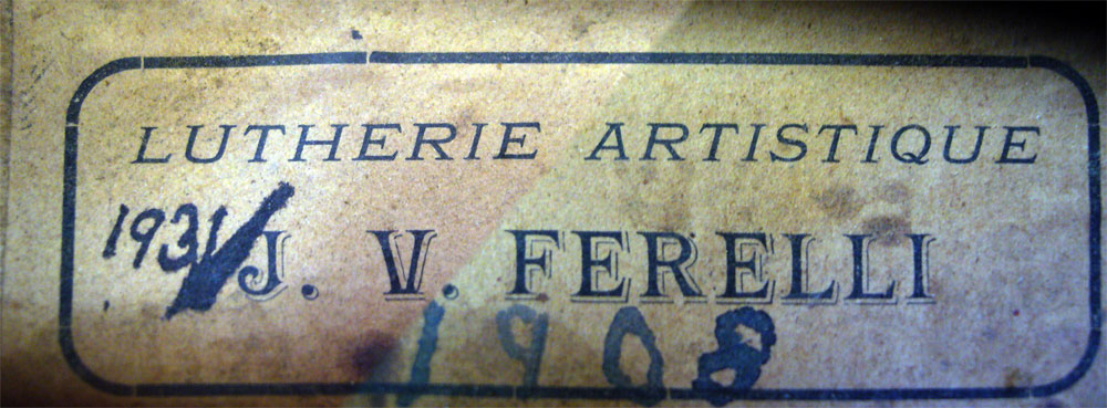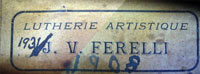 This French violin bears a label with the name J. V. Ferelli on it, and two handwritten dates - 1931 and 1908. J. V. Ferelli was a generic label used by the Mirecourt-based firm of Laberte & Magnié between 1910 and 1940 (according to Baxter). The Laberte firm was established in 1790 by an ancestor of Marc Laberte (b. 1880) Henley however points out that Laberte's amalgamation with the Fourier-Magnié firm only happened in 1925, so this label came in to use only from that time onwards, hence this violin was likely made after 1925, probably in 1931, as shown by the handwritten date in it. What the 1908 in it stands for is anyone's guess.