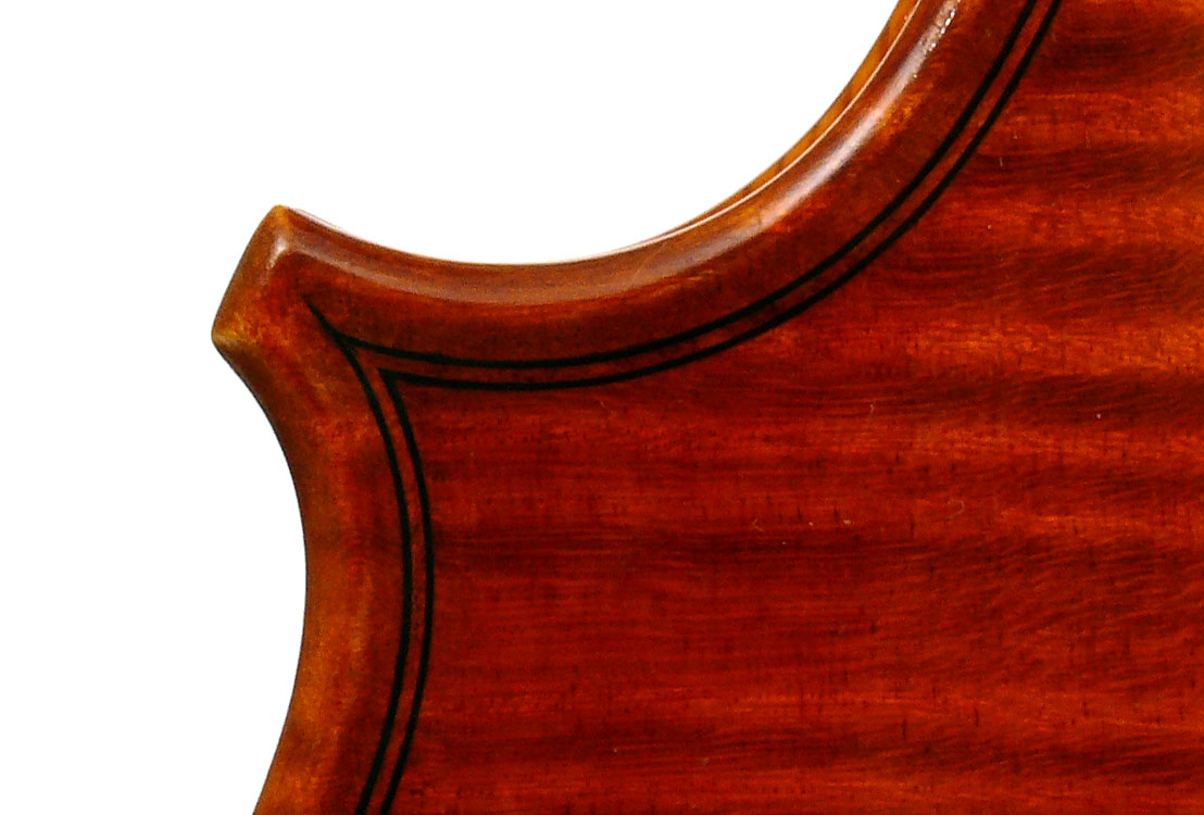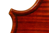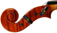 This violin was make in Kazanlak in 2007 and is in superb condition. Its most striking feature is its beautiful two-piece back of nicely flamed Balkan maple with a straight narrow curl, repeated in the ribs, neck and scroll. The tracing of the purfling is clean and really impressive, with impeccable corner work - the bee-stings are neat and demonstrate an experienced and steady hand. The table is of fine tone spruce with a straight medium grain.