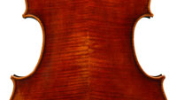 The two-piece back and sides are of well-flamed maple with an irregular mild medium curl that truly appeals. Material for the top is unusually well-chosen - an attractive finely grained tone spruce of slow growth, with narrow winter growth in the centre widening to the flanks. The neck and scroll are of lesser flamed material. The deep red-brown varnish is based on a French recipe and beautifully compliments the wood, adding a rich lustre to the appearance.
