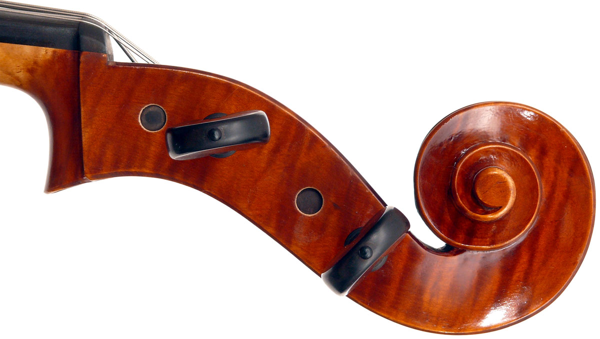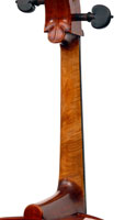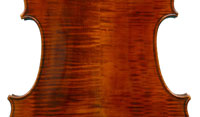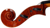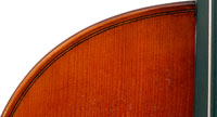 The two-piece back and sides are of well-flamed maple with an irregular distinct medium curl with good visual impact. The top is of attractive medium-grained tone spruce of fairly open growth lines and the scroll wood is nicely figured. The golden brown varnish is based on a French recipe and compliments the wood nicely. This instrument shows very tidy work and attention to detail - throughout it gives evidence of experienced craftsmanship and a steady hand.