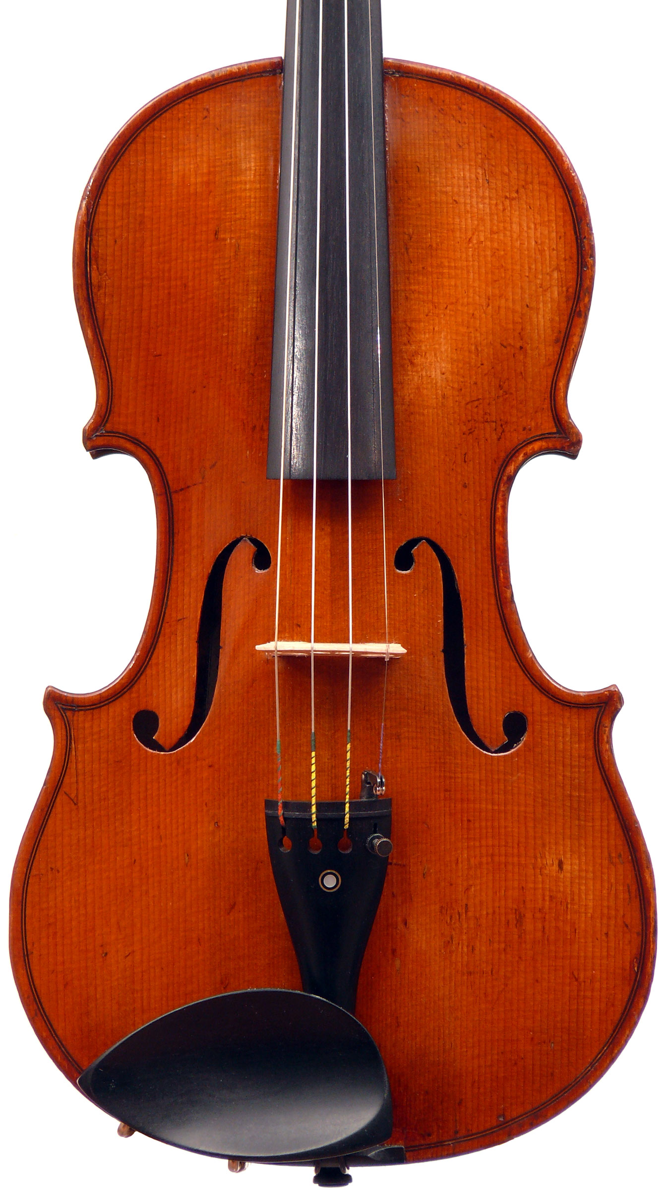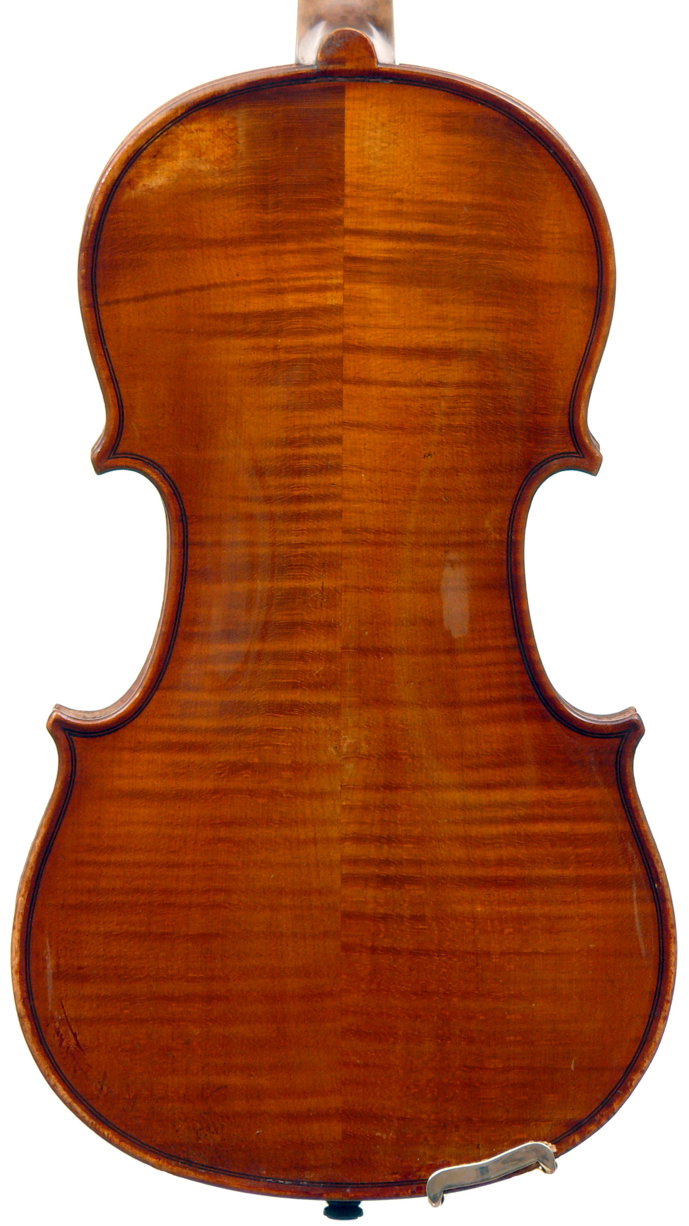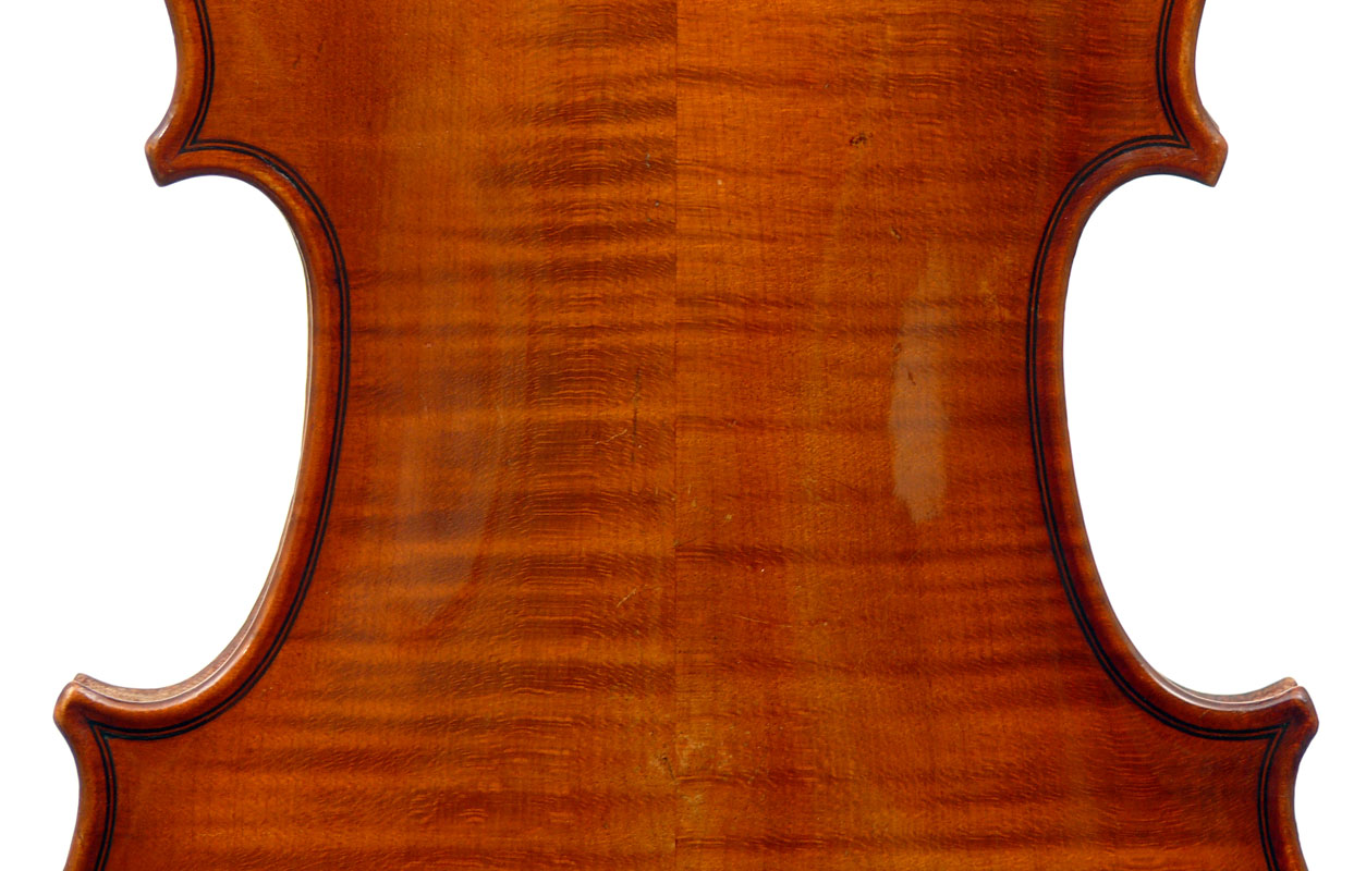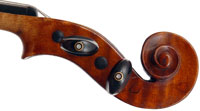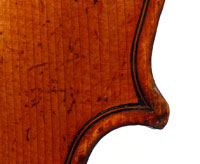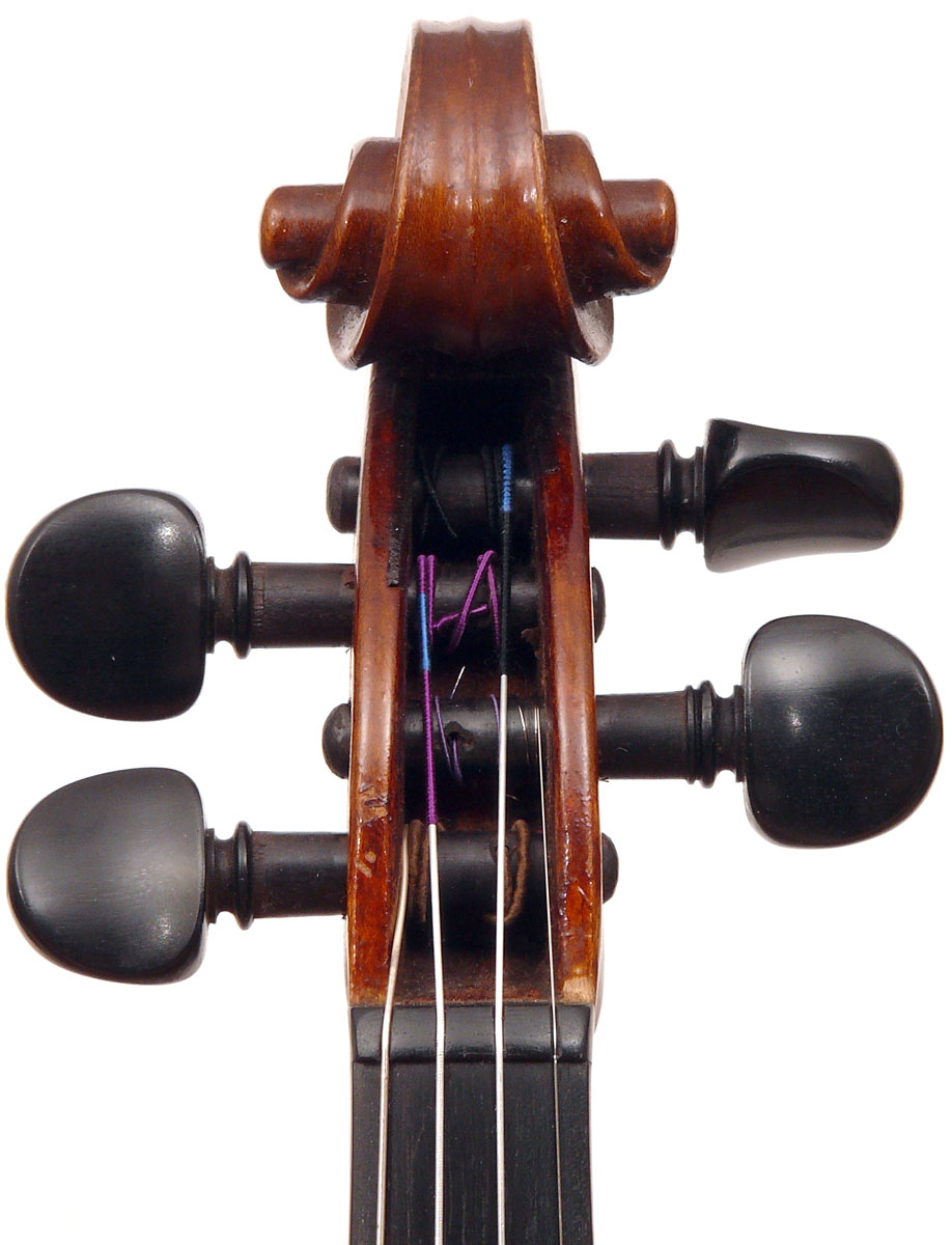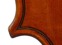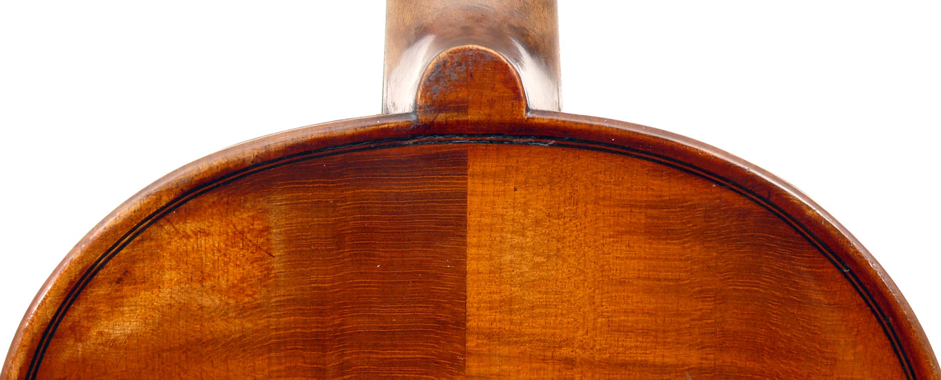 This violin has immediate visual appeal - it's an attractive instrument made of handsome materials, well made and in good condition. The two-piece back is of good maple of a straight medium curl and mild flame. The ribs deviate from the norm of wood matching the back and using the same wood for all the ribs sections all the way round, inasmuch as different unmatched pieces are used for different sections. This is itself has no tonal implications but points at the traditional giving way to the perfunctory and may have a bearing on the violin's authorship. The top is of excellent tone-spruce of fairly open grain, widening to the flanks. The neck and scroll are less flamed, the purfling somewhat ponderous, but the cornerwork is very neat.