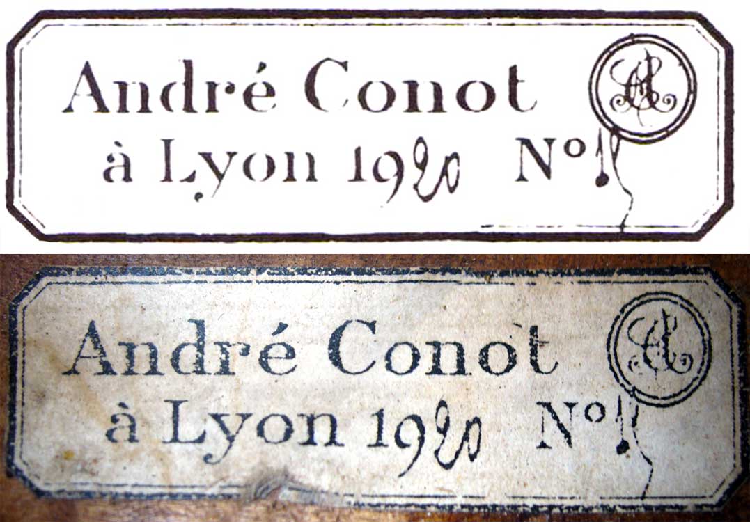 The label in this violin is a direct replica of a known André Conot label which has been replicated in the Dictionnaire Universel des Luthiers of René Vannes (label no 523). It has the same reference number and handwriting and there can be no doubt that the label in this violin is a replica of that label (The photos below show the label in this violin and compares it to the replicated Conot label in the Vannes publication). The practice of copying labels out of books and other publications and fitting them into instruments is an outrage aimed at misleading and deceiving and is invariably driven by a financial imperative. Which all means that this violin has manifestly nothing to do with André Conot.