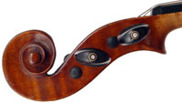 It should be mentioned that a repair has been done to a bass bar crack in this violin. In this case the repair makes use of a piece thin fabric glued across the entire inner surface of the violin's top, lining it from edge to edge. The use of fabric as a stabilizer instead of the traditional wooden cleats is highly unorthodox and the jury is still out on the pros and cons. But it's certain that more established violin makers shy away from the used of fabric for repairs, except in certain cases of repairs to ribs, particularly in cellos. In this case the violin has undergone superb French polishing which renders the crack almost invisible.