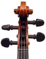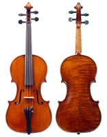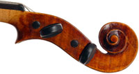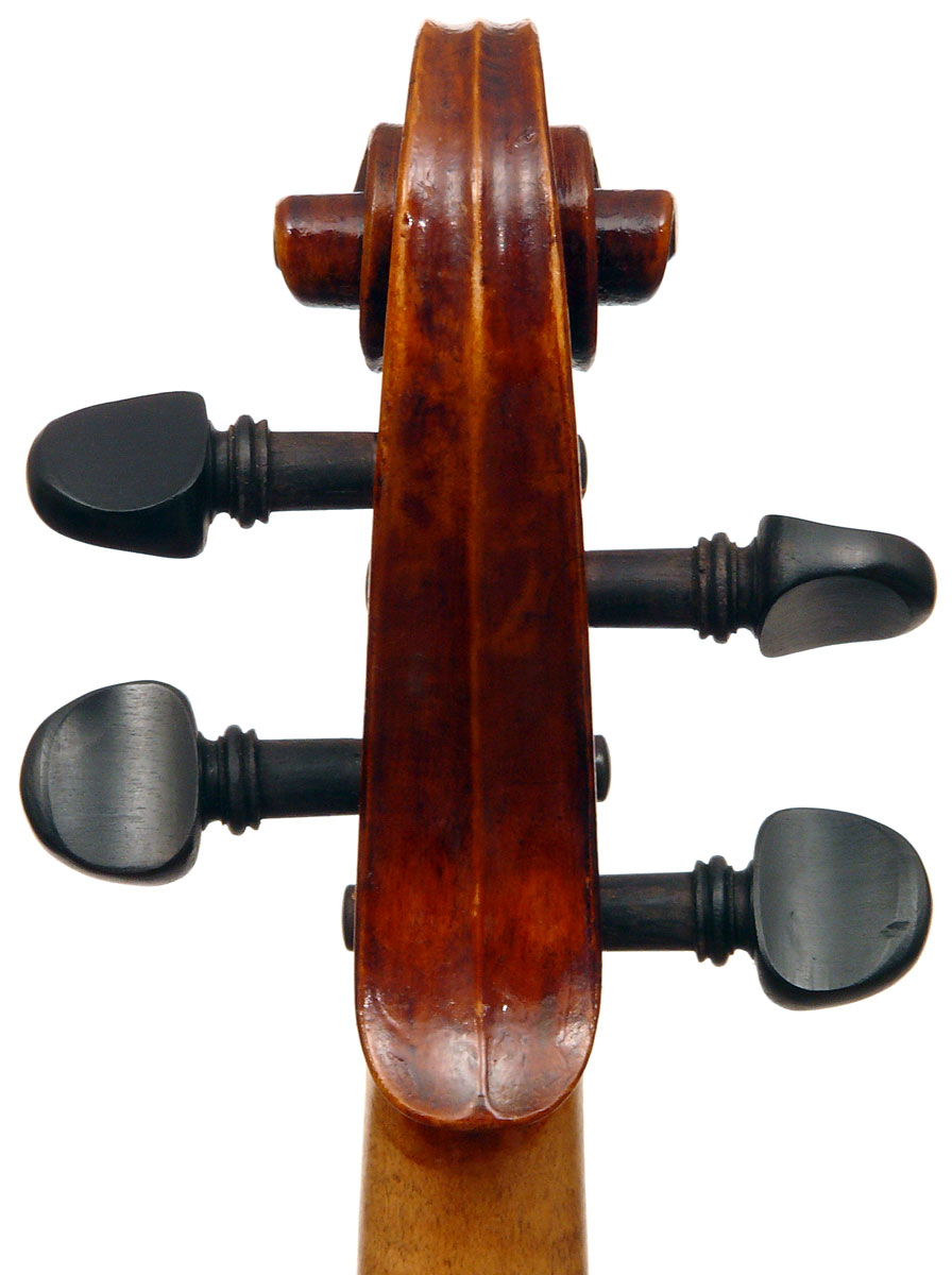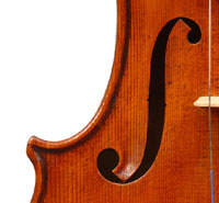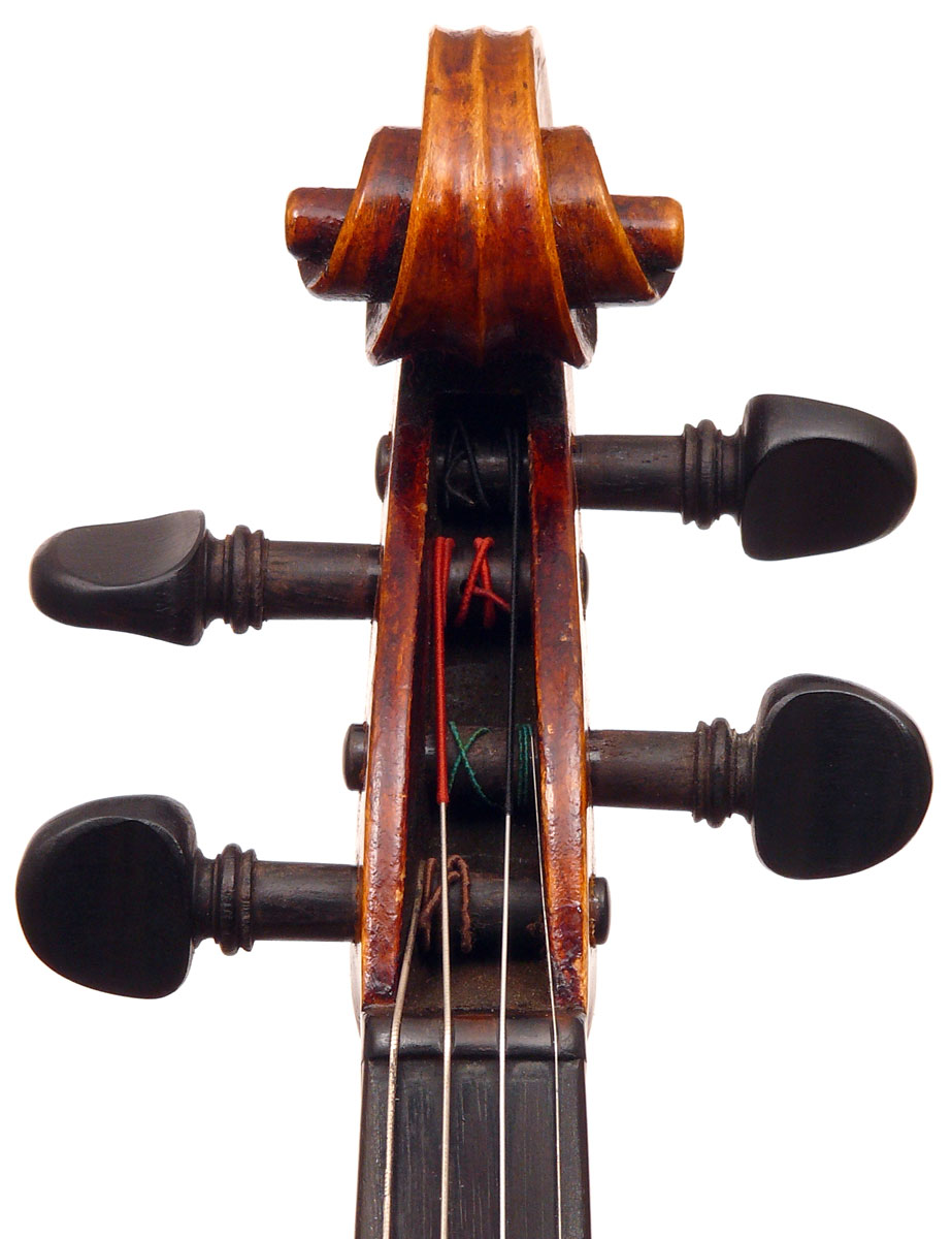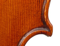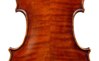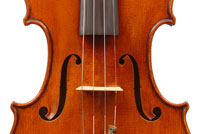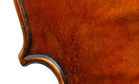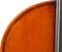 The two-piece back is unassuming but nevertheless of subtle charm, made of mildly and unevenly flamed maple with a broad curl. It appears that the same wood was used in the sides, neck and scroll. The top is of superb tone spruce with very straight and even growth lines, very closed on the centre seam and opening more to the flanks. There is great attention to detail in the Fs, purfling and corners, with the Fs being crisp and tidy and the palettes nicely fluted - a sign of good workmanship. The finish on the inside is clean and correct. The scroll is elegant, almost feminine and well-balanced. The varnish in the top is a nice golden brown with a tinge of red. In the back, sides and scroll the reddishness predominates. The varnish is highly transparent, complimenting the beauty of the materials, particularly in the front. This instrument is in very good condition.