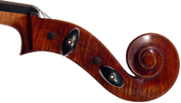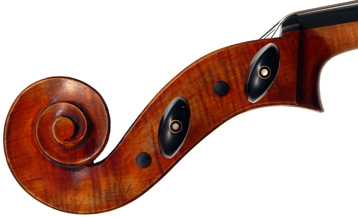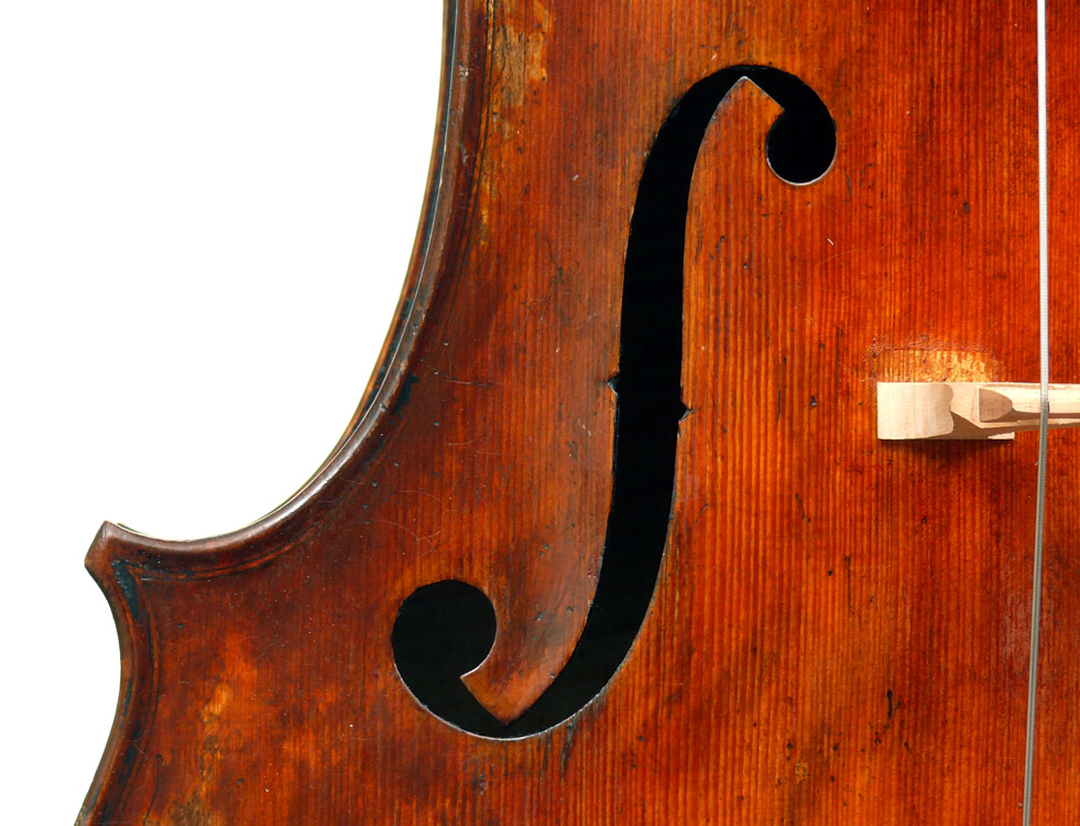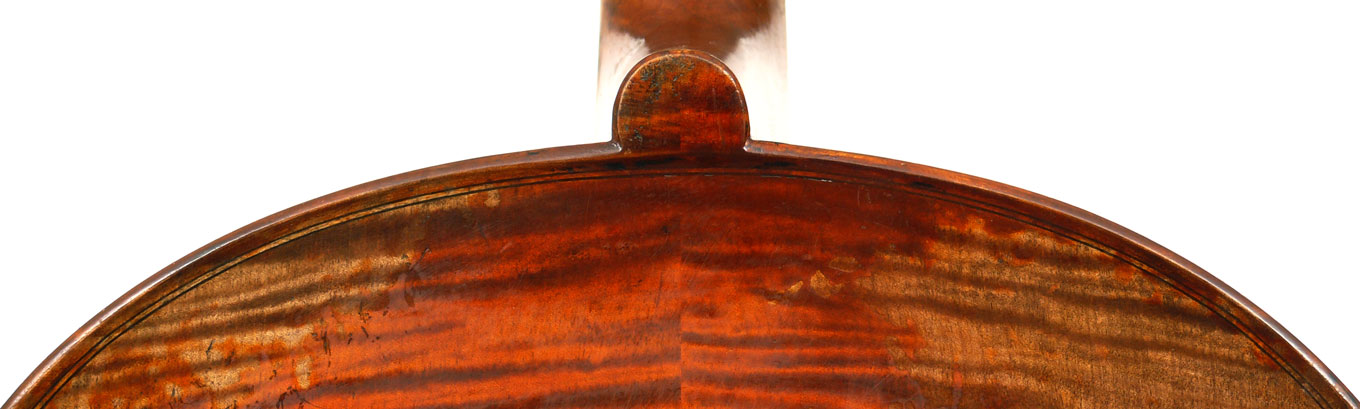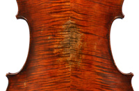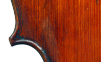 This cello has superb tonal properties suitable for solo work. It is fully compliant with professional requirements - evenly balanced throughout and speaking with openness and responsiveness, easy to play on. The materials are well chosen - the sides appear to be matched with the wood of the beautiful two-piece back, showing attention to detail and to the traditions of good lutherie. Workmanship is very good throughout - tidy work in the corners and purfling neatly traced. Varnish is an amber to dark red-brown oil-based application over a yellow ground that altogether really nicely compliments the wood.