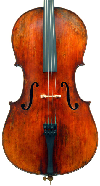 This cello is a new instrument, but has been artificially antiqued to resemble an instrument from the 18th century. Such techniques are quite refined and specialized and even include inducing (and repairing) a few edge cracks. In this case a repaired deliberate crack runs up from the saddle, adding to the instrument's appearance as being genuinely old. Yet, the antiquing is only skin deep - the cello is in excellent condition as one would expect from an instrument made only last year and being virtually unplayed.