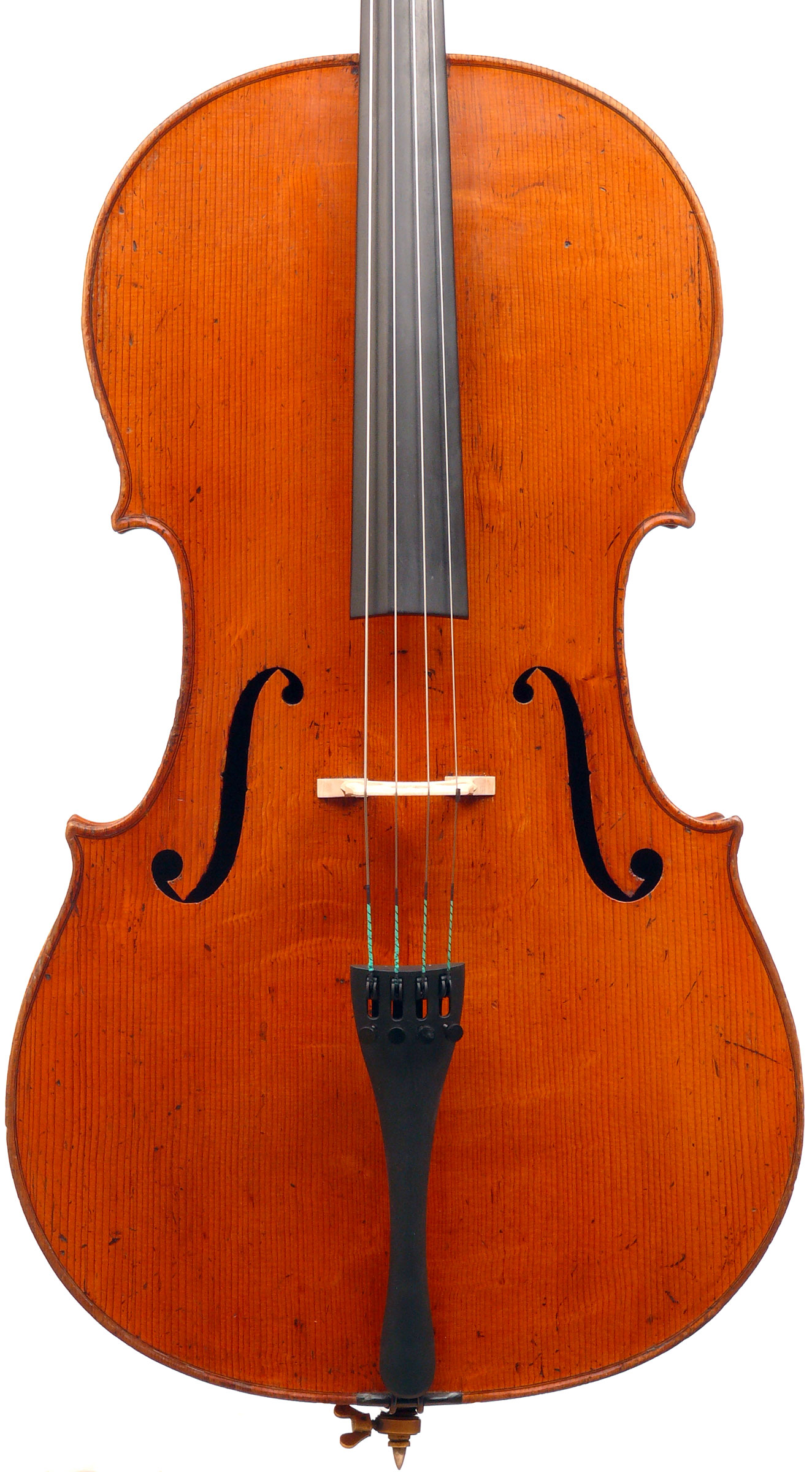 This cello was recently fitted with a new Belgian bridge and currently has Evah Pirazzi strings on it. However, it has a very old-style end-pin, which adds to its charm.