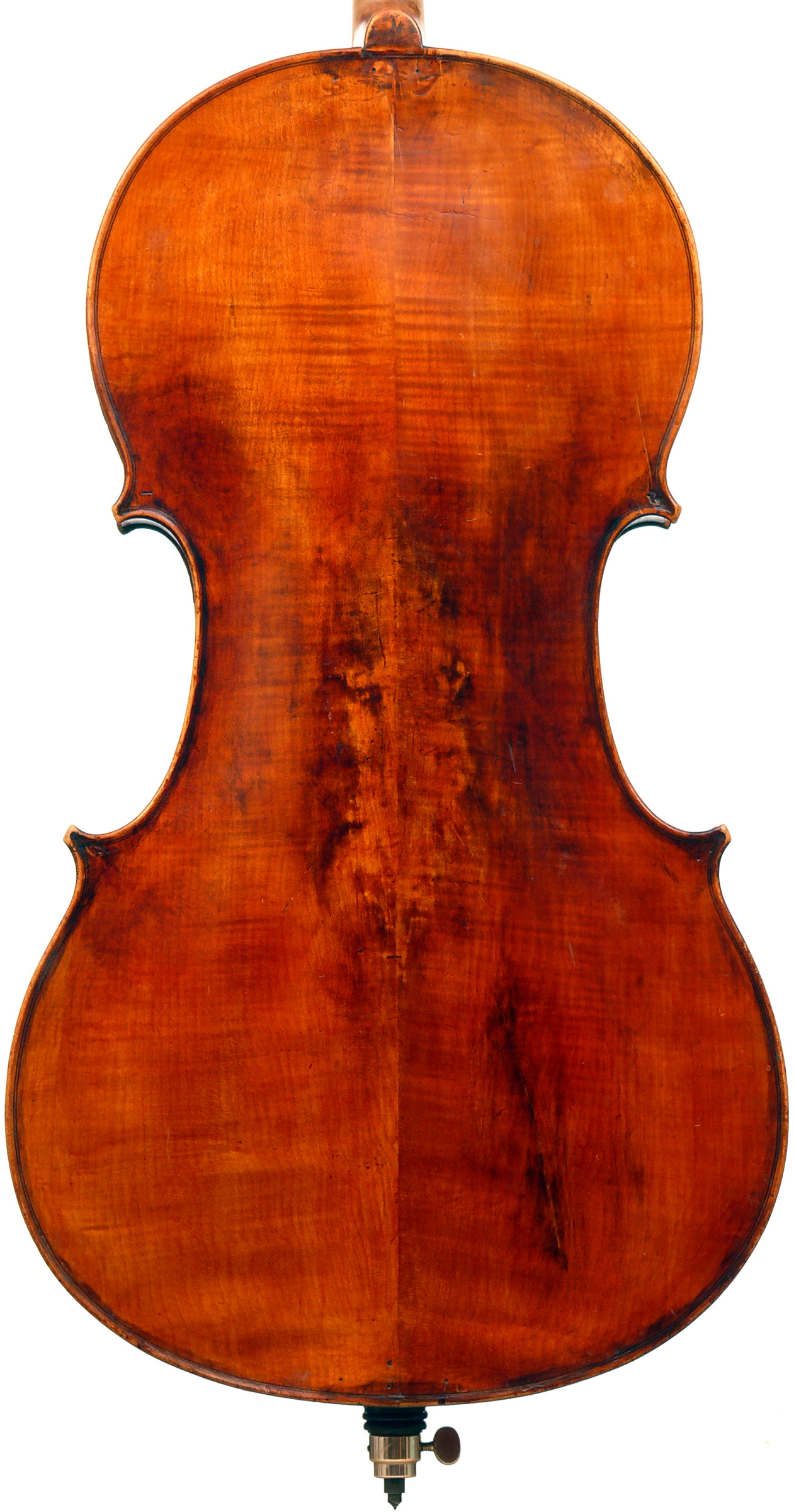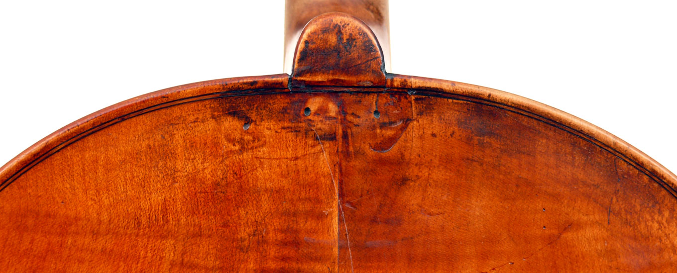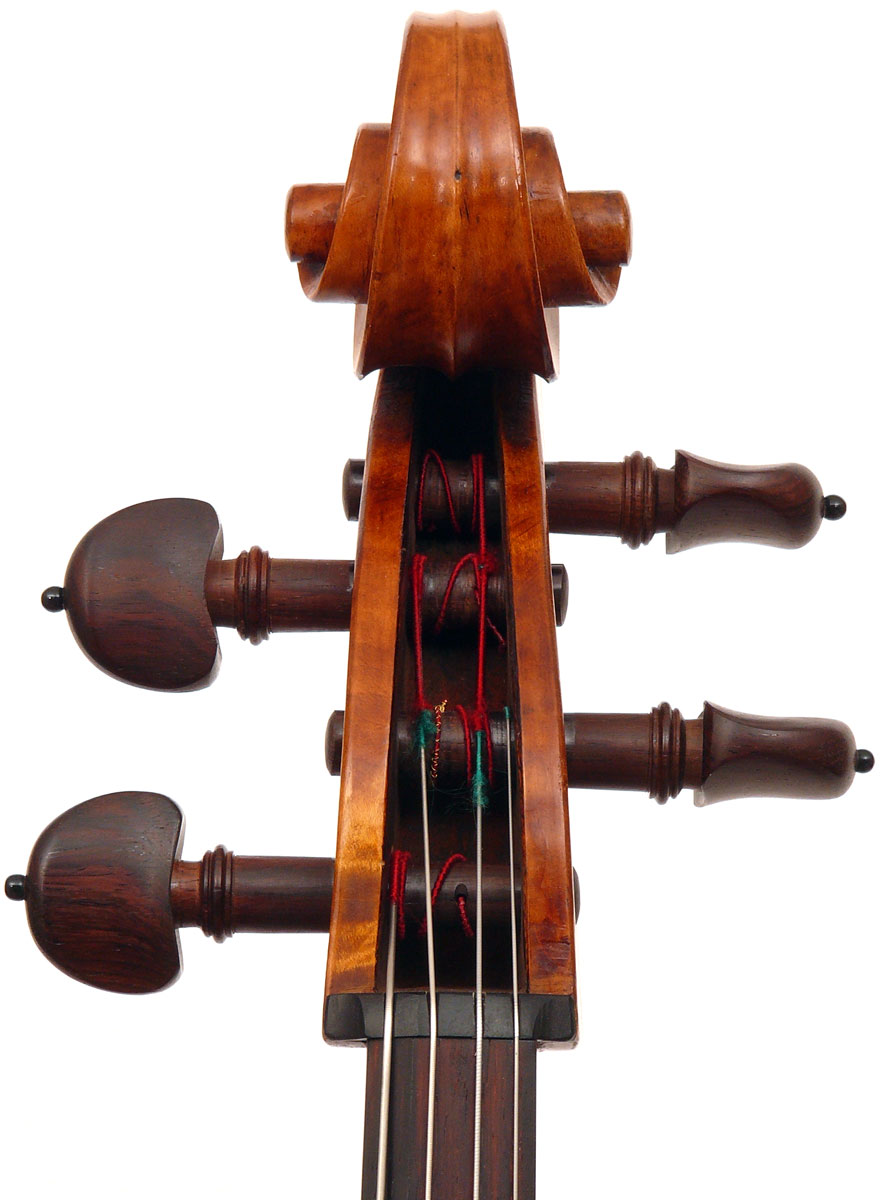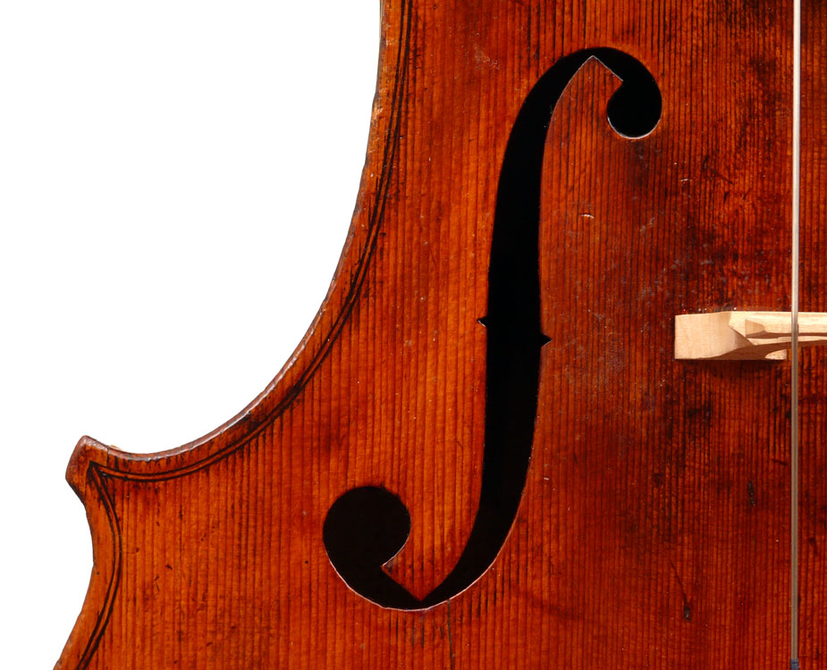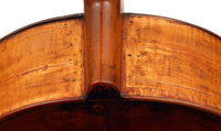 This cello is blatantly based on the Stradivari model - an attractive instrument with elegant lines. All the materials in it are good, although the back, sides and scroll are of less-figured wood, the feeling with this cello is that the emphasis was on making a sonorous and responsive instrument, rather one of shallow prettiness. The varnish is in keeping with what is stated in various publications about this maker's work - his original formula was of a golden-brown oil varnish which over the years oxidized into a beautiful reddish-brown or amber shade - exactly what we see in the cello.