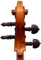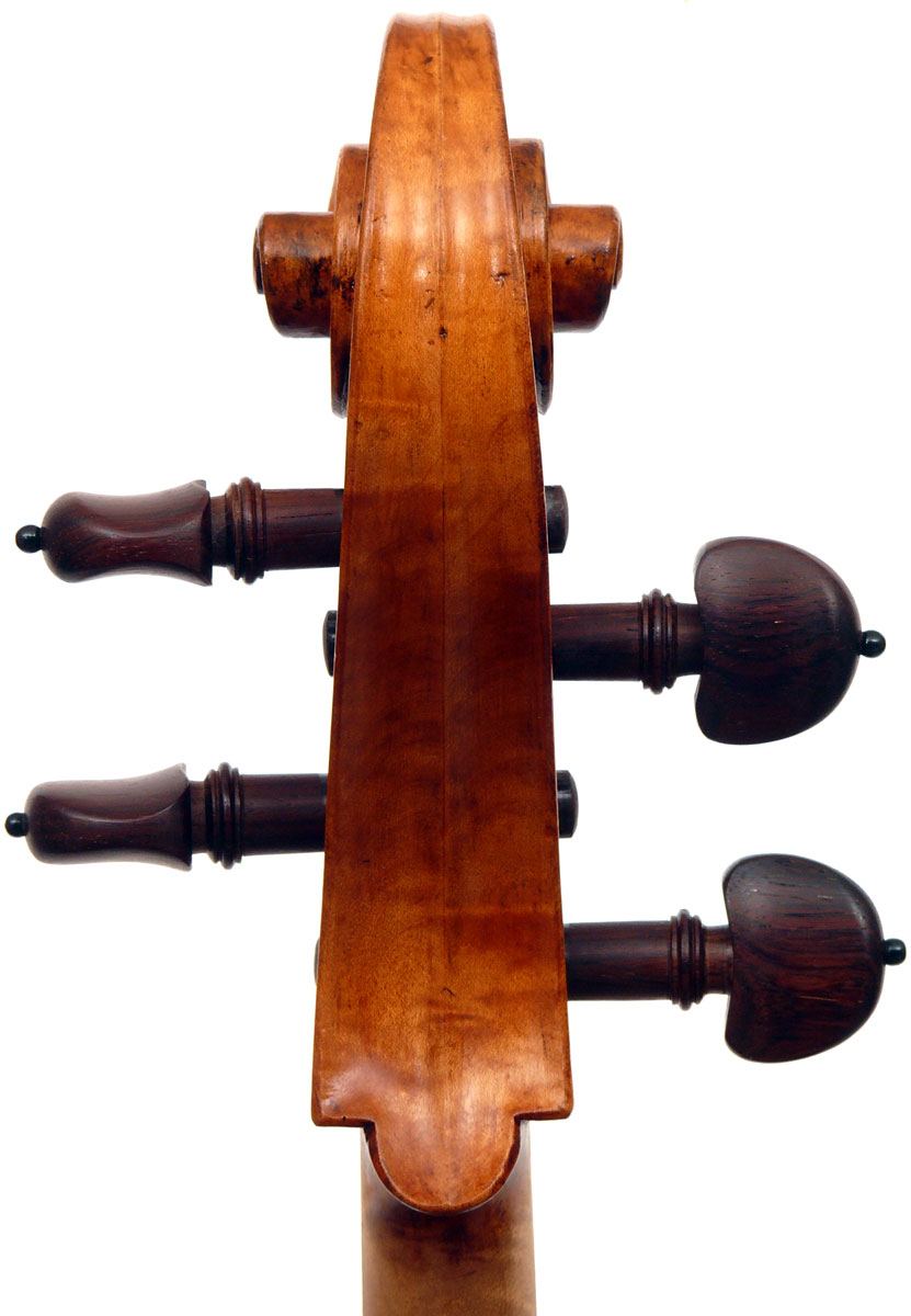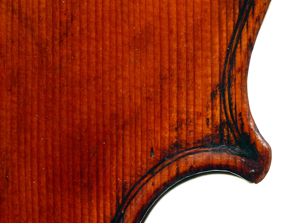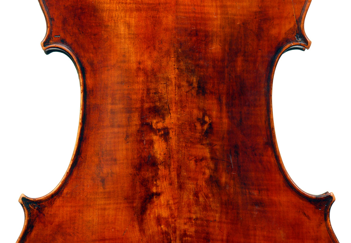 This cello is blatantly based on the Stradivari model - an attractive instrument with elegant lines. All the materials in it are good, although the back, sides and scroll are of less-figured wood, the feeling with this cello is that the emphasis was on making a sonorous and responsive instrument, rather one of shallow prettiness. The varnish is in keeping with what is stated in various publications about this maker's work - his original formula was of a golden-brown oil varnish which over the years oxidized into a beautiful reddish-brown or amber shade - exactly what we see in the cello.