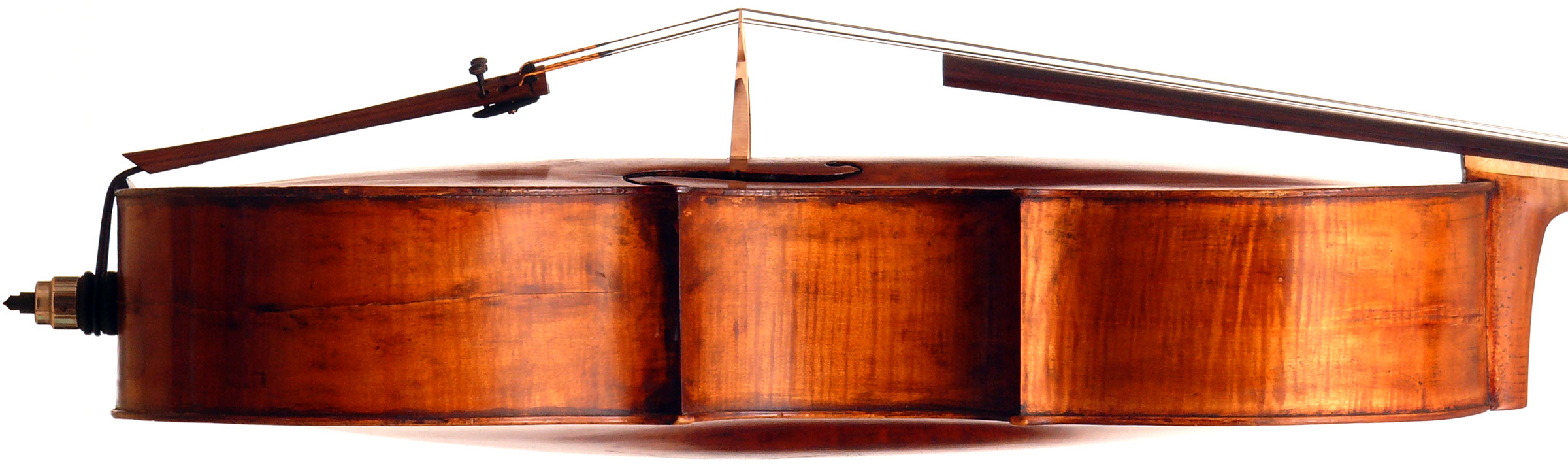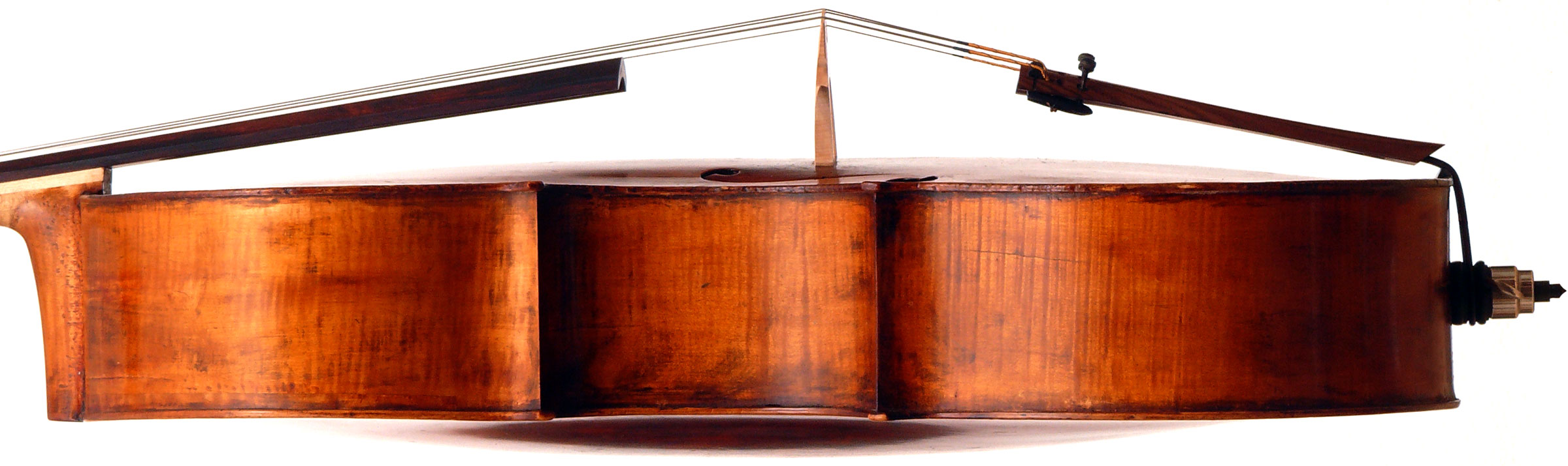 This instrument has had many repairs. Instead of discussing each individually, suffice it to say that this cello was subject of a large-scale in-depth restoration over the past two years. I went to a lot of trouble to verify each repair and can assert that the work was done thoroughly and correctly and that the cello is structurally perfectly secure. Especially noteworthy is that the crack in the rib around the lower bout (treble side) has been reinforced for its entire length with a strip of wood on the inside, heat-bent to cover the crack perfectly. Also, the shim (wedge) under the fingerboard appears to have been the best option rather than removing and resetting the neck, which would have engendered other problems. This wedge serves as more than simply raising the elevation, but rather makes for a restructuring and reinforcement of the neck itself - quite ingenious. Lastly, the brand new fingerboard is perfectly graded - all round good work.
