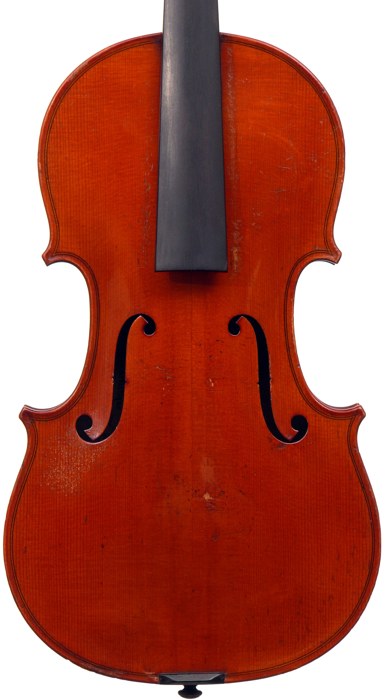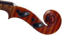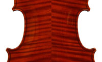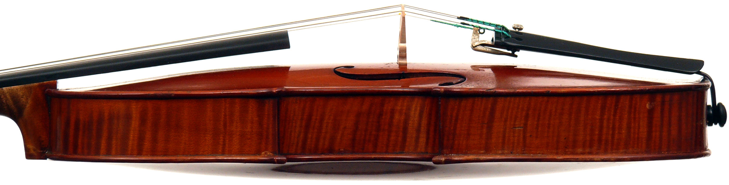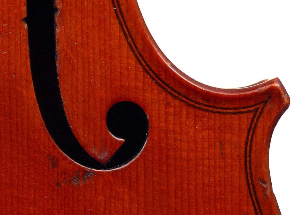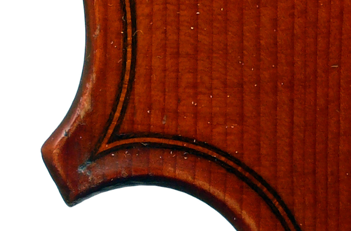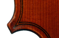 What strikes one immediately of this violin is the attractive choice of materials - the two-piece back, ribs, neck and scroll are of well-figured maple with a distinct deep flame of medium curl. The top is of good closely grained tone spruce. Purfling and particularly the cornerwork and mitres are exceptionally tidy. The reddish-brown varnish is unusually transparent, allowing the wood the be shown off well.
