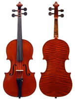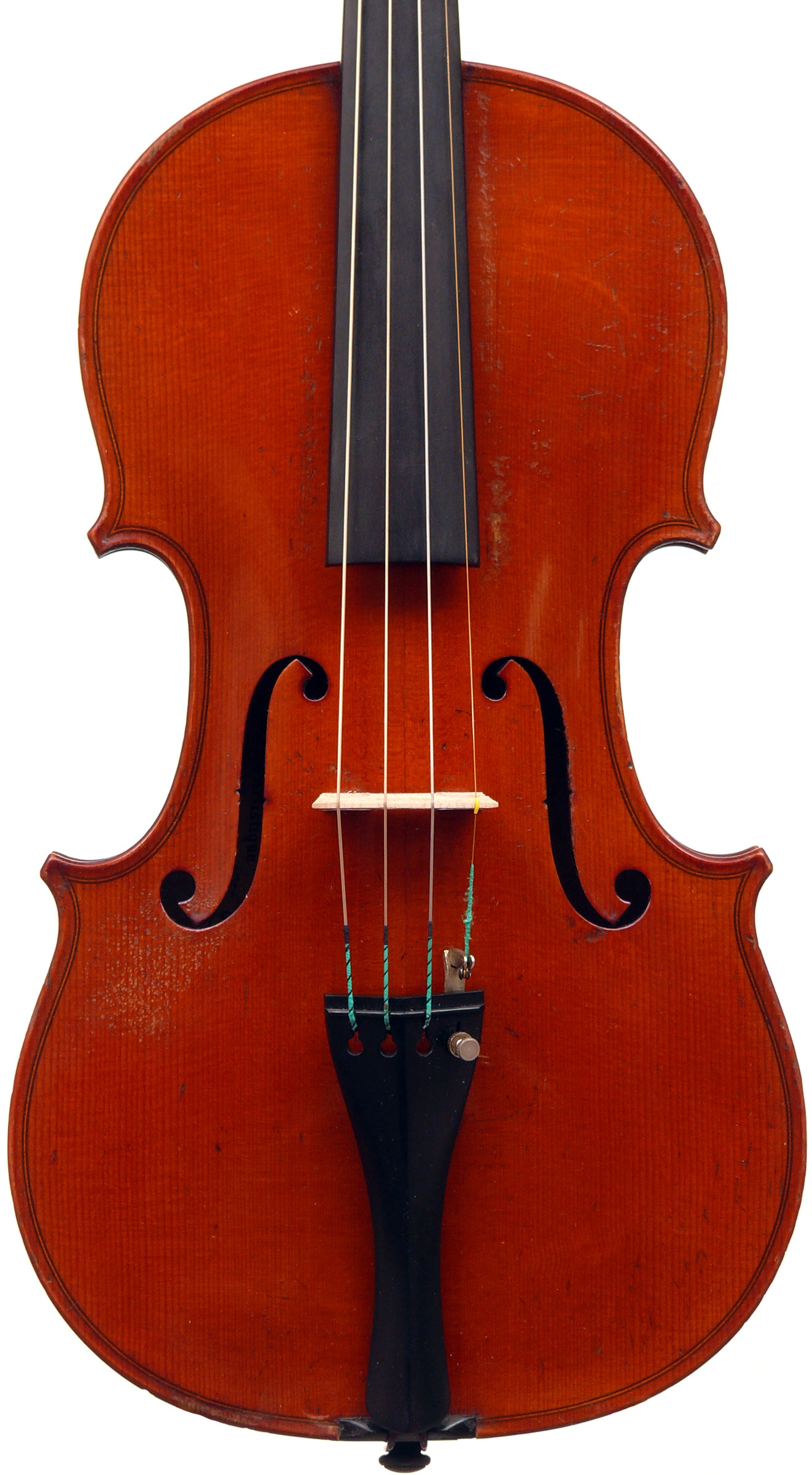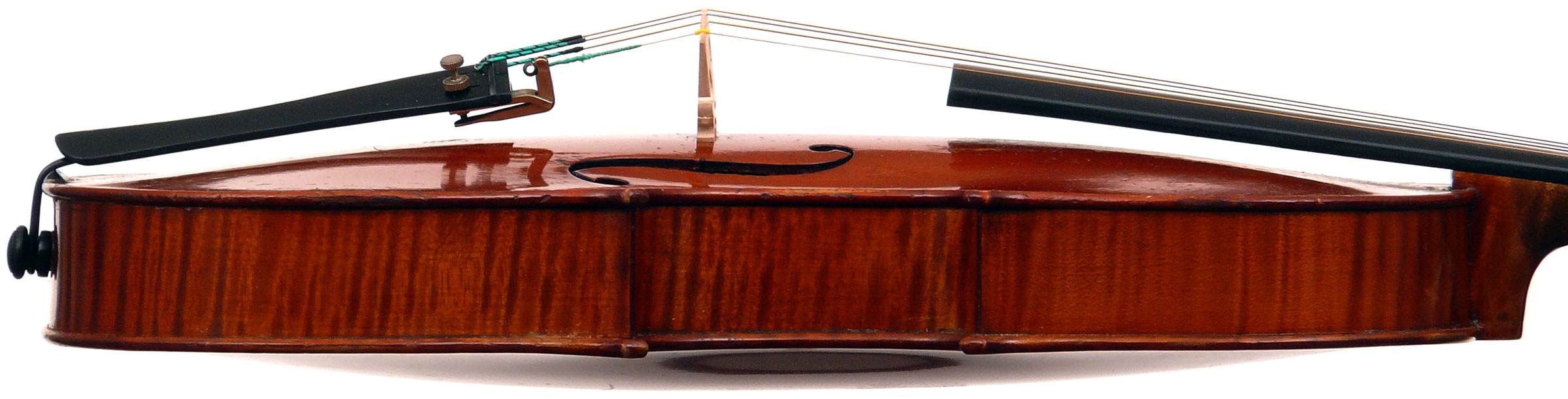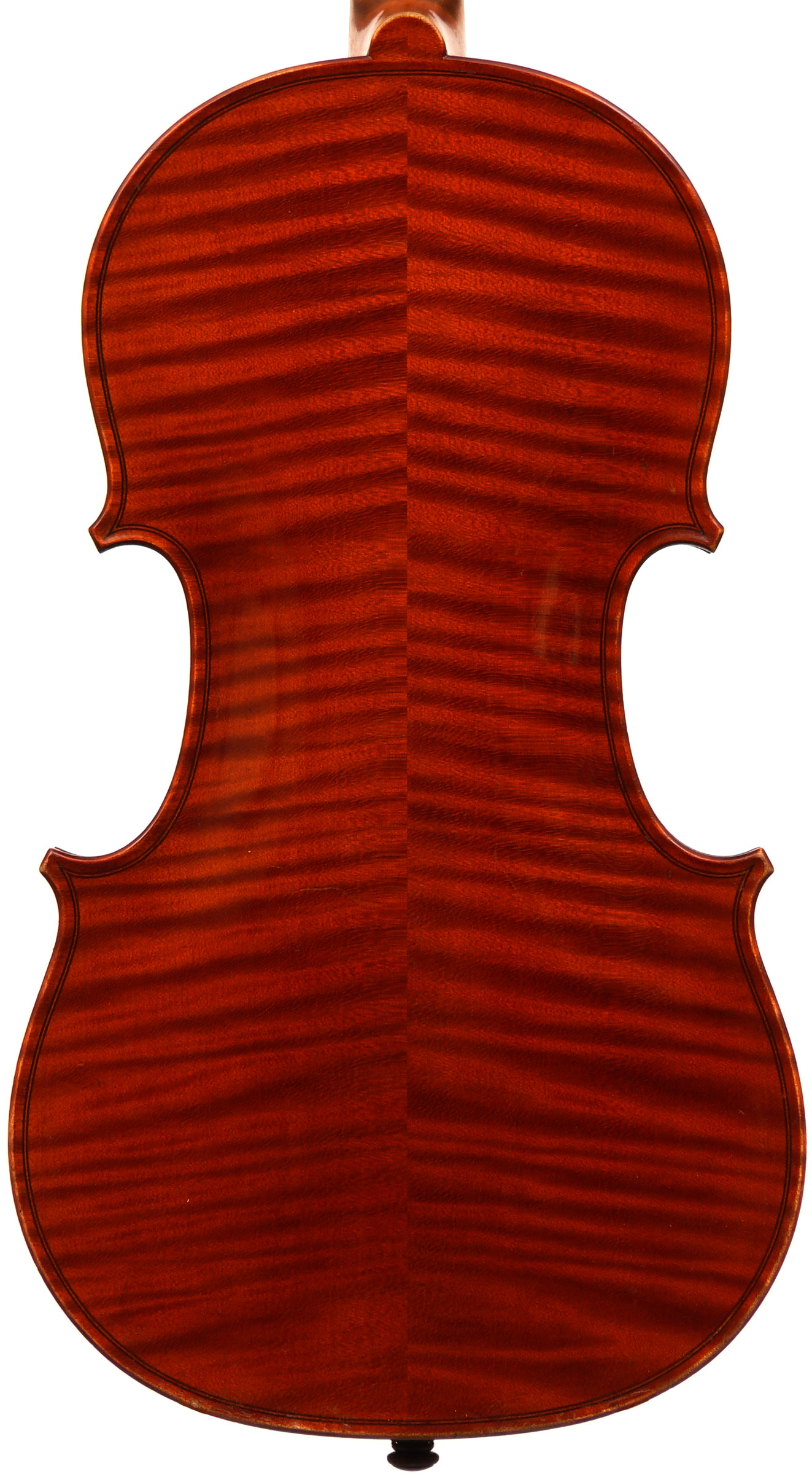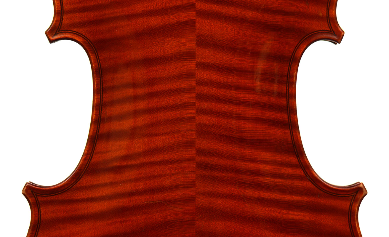 What strikes one immediately of this violin is the attractive choice of materials - the two-piece back, ribs, neck and scroll are of well-figured maple with a distinct deep flame of medium curl. The top is of good closely grained tone spruce. Purfling and particularly the cornerwork and mitres are exceptionally tidy. The reddish-brown varnish is unusually transparent, allowing the wood the be shown off well.