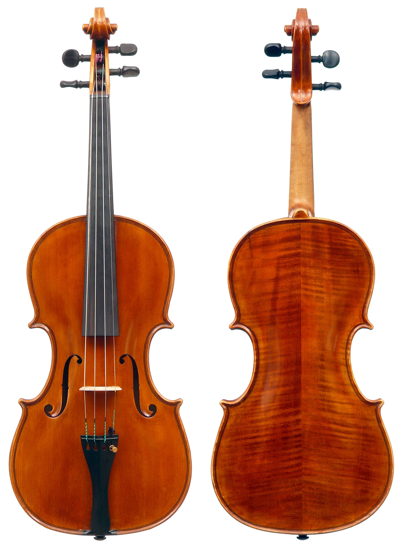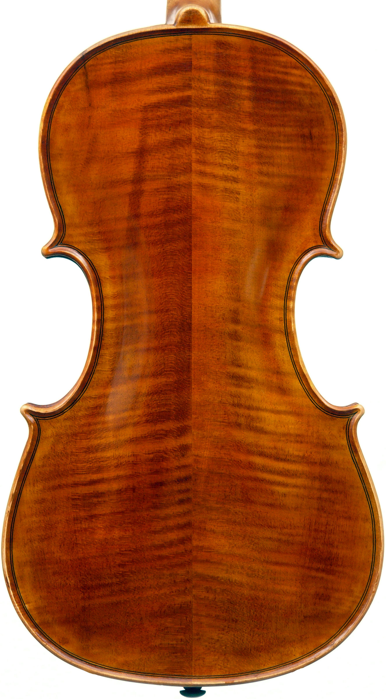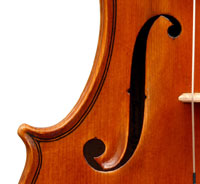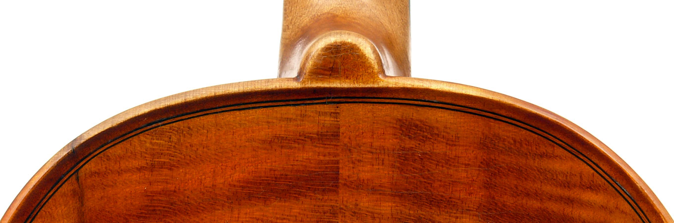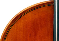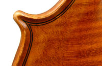 The two-piece back and ribs are of mildly flamed maple, with the neck and scroll being of more plain wood. The top is of superb Italian spruce with very narrow growth lines at the centre line widening to the flanks. The Fs are crisp with beautifully fluted wings. The purfling is supremely well-traced and the mitres simply outstanding (see photos). The varnish really deserves special mention - the texture is almost silky, not glossy but rather glowing and appears to have flexibility and also excellent transparency. The light-brown colour has a touch of red in it and compliments the materials nicely.