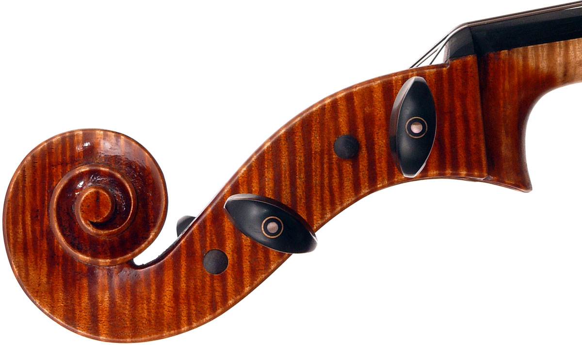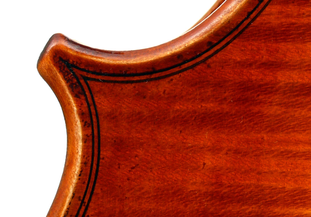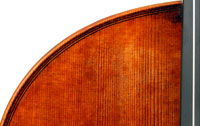 Secondly, the choice of materials is excellent and very attractive - the maple used for the two-piece back, ribs, neck and scroll has a very distinct flame with a narrow straight curl - truly beautiful with strong visual impact. The top is of very attractive tone spruce with fairly narrow to medium growth lines. Workmanship is highly refined throughout, evident in the cornerwork, the purfling and fine mitres, also in the beautifully carved scroll.