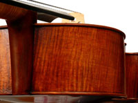 The varnish is a lovely intense reddish brown and has been deliberately reworked just enough to break the 'new' look and give it an aged appearance without actually antiquing the instrument. All who have seen this cello loved this aspect.