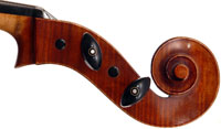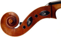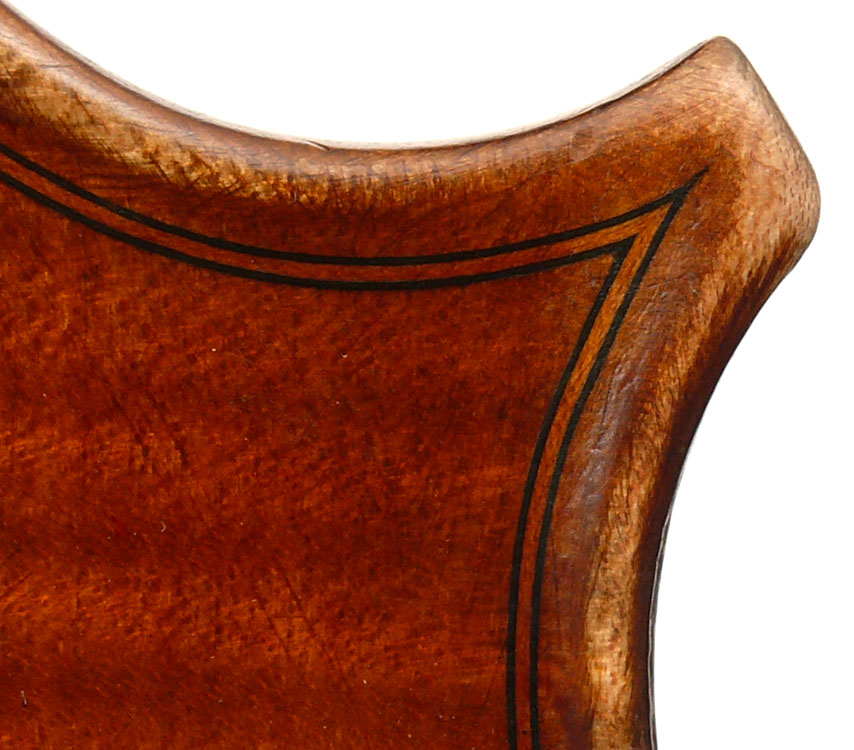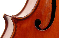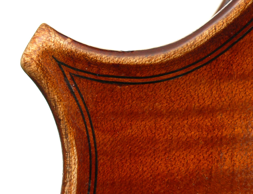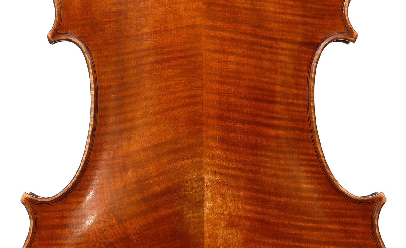This cello is made of a fine selection of materials. The two-piece back, notably, is of nicely figured maple with some attractive and irregular curl. Throughout the workmanship is superb, attesting to an experienced and steady hand, particularly noticible in the tracing of the purfling, the tidy cornerwork with superb mitres. The Fs are somewhat elongated, slender and very elegant. It seems that someone (not the maker) tried to modify the fluting in the wings in this cello's early years.
