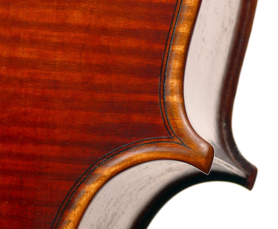 Close examination of this instrument shows remarkably tidy work with meticulous attention to detail - take a look at the photos and in particular the cornerwork which shows impeccable mitres and finish to the corner shape. The scroll is exceptionally balanced and elegant. Throughout this cello gives evidence of craftsmanship of a high order.