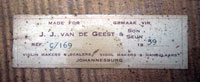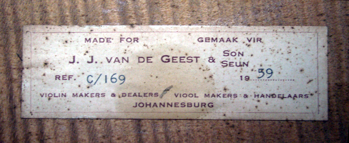It is fitted with the studio label of J. J. van de Geest, dated 1955 (see photo). Apart from his own personal output as violinmaker, J. J. van de Geest had a very successful business in Johannesburg to which he imported many fine instruments, from both high-end fine Cremonese and French items to more commercial instruments aimed at the student and amateur market. The latter he sourced from mainly Germany, Holland and at times from Japan. Such instruments were usually of good quality and he always labelled them as "Made for J J van de Geest" (as in this case), followed by additional information, such as a serial number, date, address, etc. These instruments were NOT made by J. J. van de Geest, but were the work of other studios.