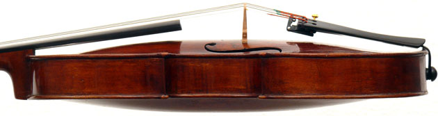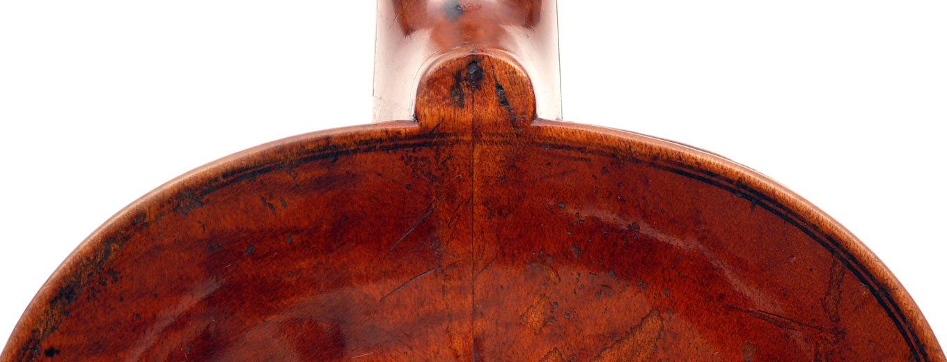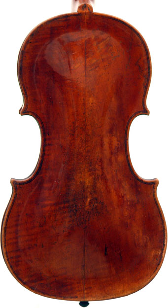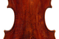 One is struck by this violin's beautiful color - a rich brown with a tinge of red, all original. The arching is full and beautifully graded. The Fs are nicely positioned and balanced. A peculiarity is that the top is from one piece of spruce, as is the entire lower rib from corner to corner. The purfling is painted in - something often encountered in English violins from that period.