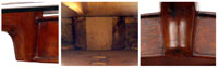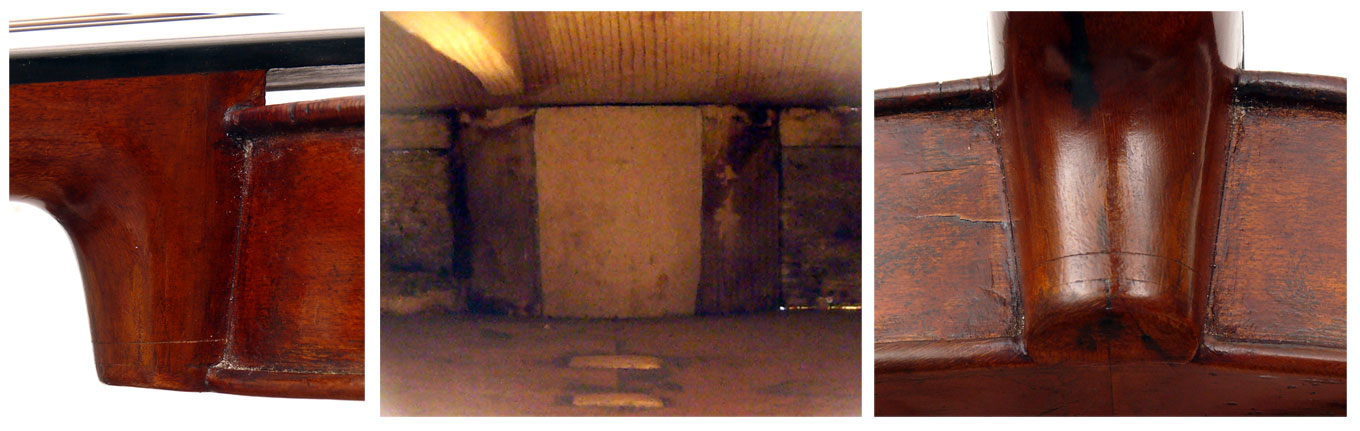 Further, the neck graft in this violin is performed at the neck root, rather than the scroll, in which it appears that a 'spacer' system is fitted into the neck block and the original neck is then grafted onto it, instead of the later method of grafting the scroll onto a completely new neck. (See the composite photo showing this work.)