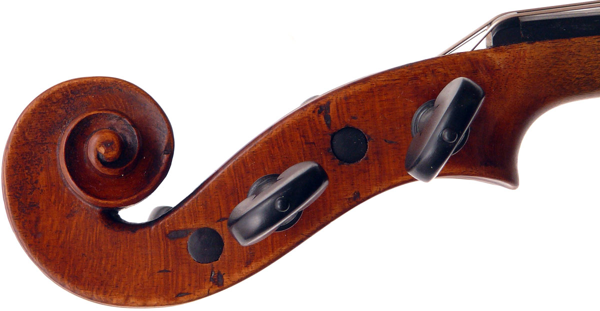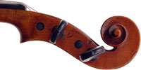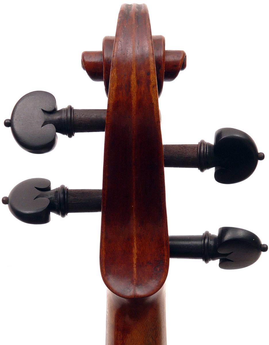 The scroll in this violin is highly individualistic, really elegant, balanced and refined, and is very reminiscent of the work of Richard Duke. It certainly is quite unlike the more perfunctory scrolls often seen in studio work. It may eventually assist in identification of the maker.