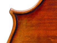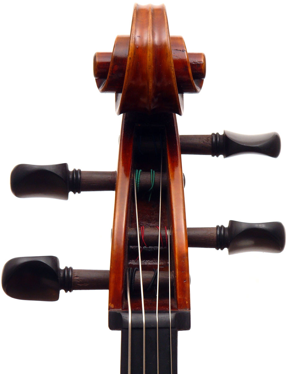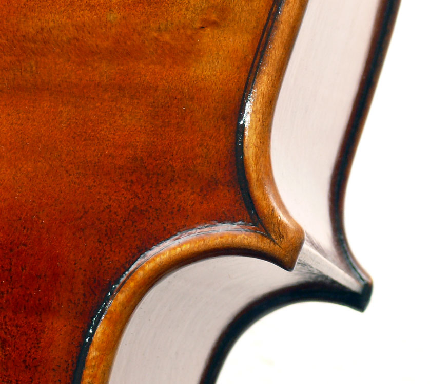 Close examination of this instrument shows remarkably tidy work with meticulous attention to detail - take a look at the photos and in particular the cornerwork which shows impeccable mitres and finish to the corner shape. The scroll is exceptionally balanced and elegant. Throughout this cello gives evidence of craftsmanship of a high order.