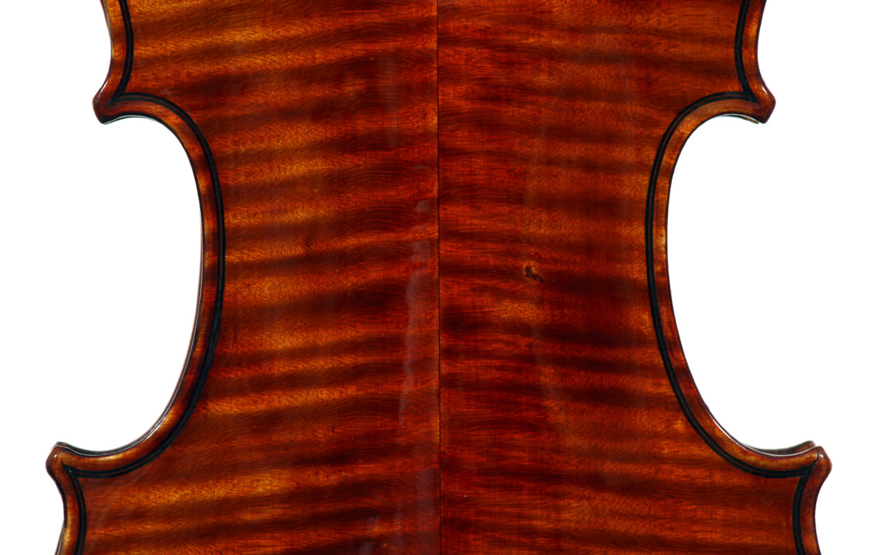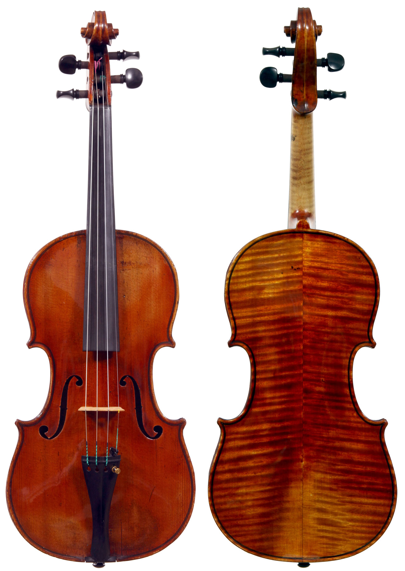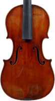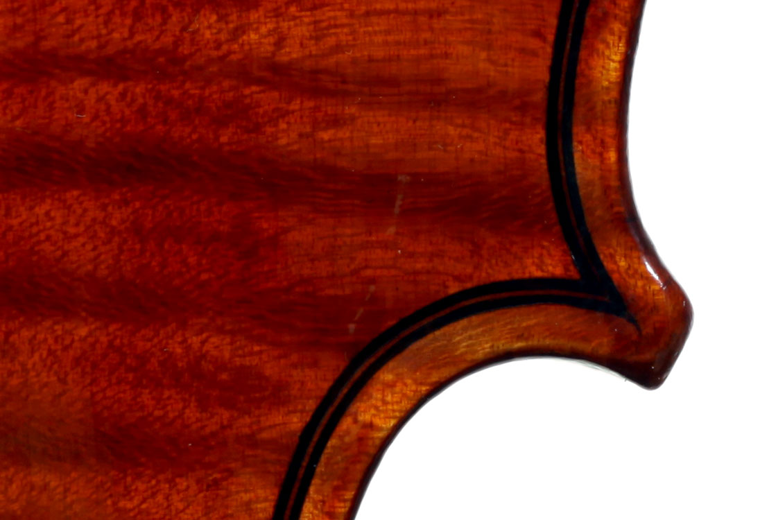 This violin is made of finely selected materials - the top is of unusually good tone spruce with a very fine growth lines at the centre seam, opening slightly to the flanks. The top is in excellent condition with only minor repairs. The back and ribs are of nicely figured maple with a distinct medium to broad curl, making for appealing flames. The Fs reveal a steady and experienced hand. It is particularly the reddish brown varnish, with a touch of ruby, that give this violin a particular visual appeal that lingers and keeps drawing the eye.