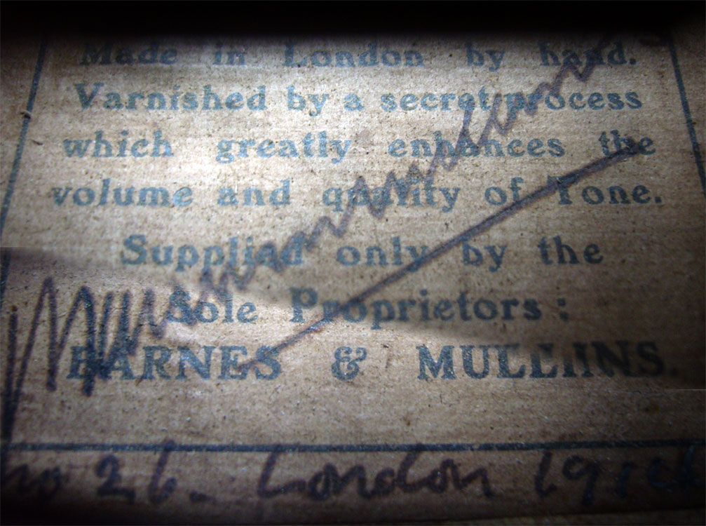 The firm of Barnes & Mullins in London were makers and exporters of violins and related instruments during the period 1905 to 1930. Several English violinmakers worked in their studio and they had a solid reputation for good work, at times importing instruments from France and Germany. They also acted nationally and internationally for some important English makers.