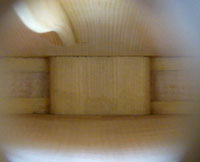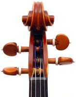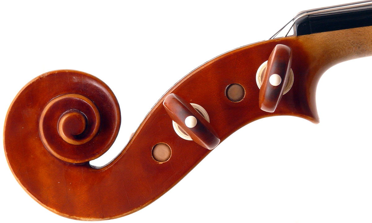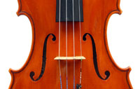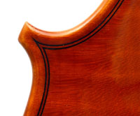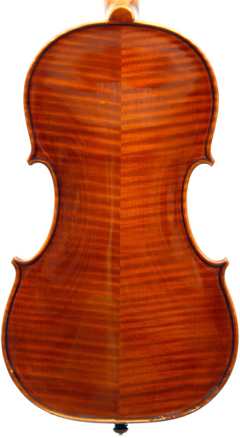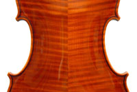 Overall this violin is characteristic of this maker's work, which generally has a bold and solid appearance in outline. Likewise, the scroll, albeit accurately and balanced in execution and extremely nicely cut, has a strong and masculin feel to it. The materials are appealing - a fine maple of medium curl and distinct figure is used for the two-piece back and is combined with good tone spruce in the top. In the back the curl slopes downward from the flanks to the center line. The sides, neck and scroll are less flamed. The oil varnish is a superb amber-brown colour and very translucent, complimenting the materials well.