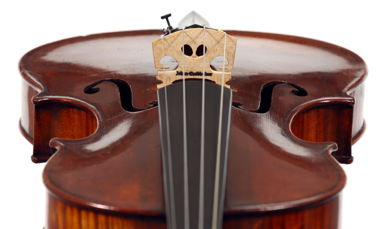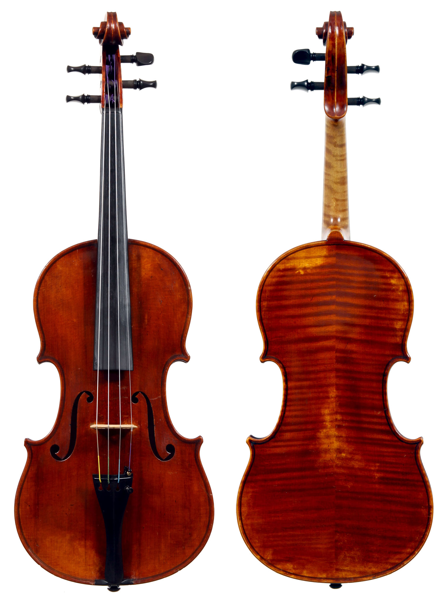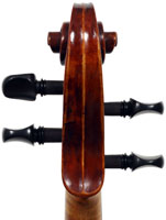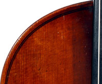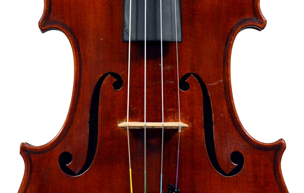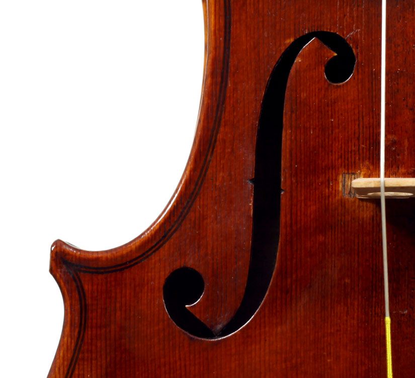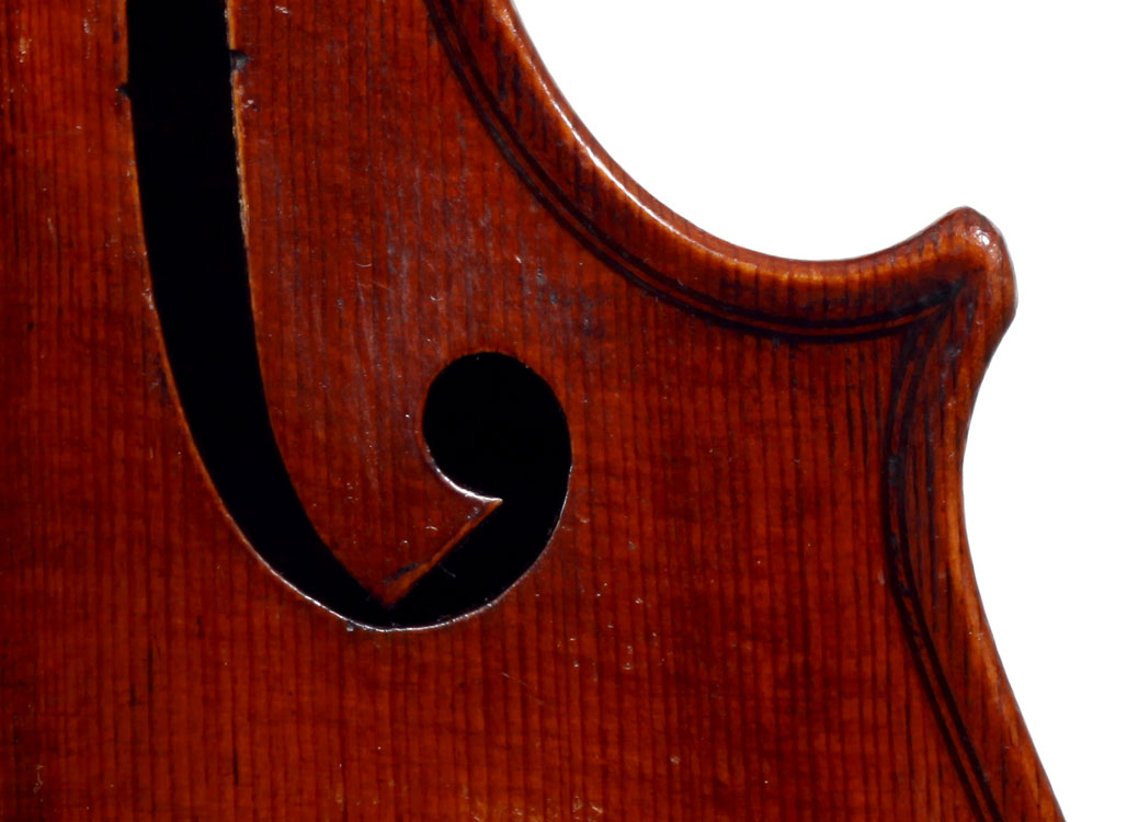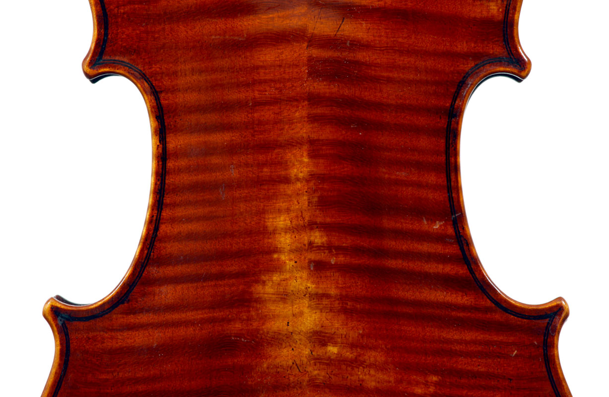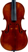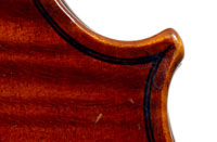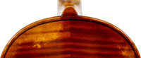 This violin is well-toned - strong, clear and responsive and speaks with ease. Materials throughout are attractive and the reddish-brown varnish is very transparent, showing off the wood nicely. The top is of an unusually finely grained tone spruce. The two-piece back and ribs are of nicely figured maple with a broad curl. Workmanship throughout is clean and steady.