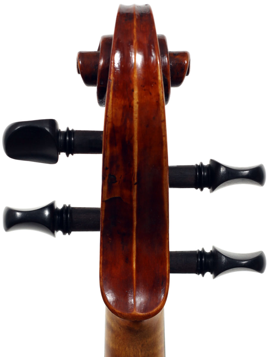 Identifying this unlabelled violin as being of French origin is easy in itself, but establishing its authorship is more complex. A calculated guess would date it to the very late 19th century. The main Mirecourt studios in those days were those of Jérôme Thibouville-Lamy ('JTL'), Marc Laberte, Laberte-Magnié, Justin Derazey, the Bernardel enterprise, to mention just a few. This doesn't look like JTL work, but attributing it to another studio is not simple as they all worked along the same lines and subscribed to the same perspectives and guidelines of French lutherie.