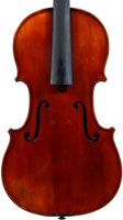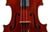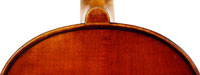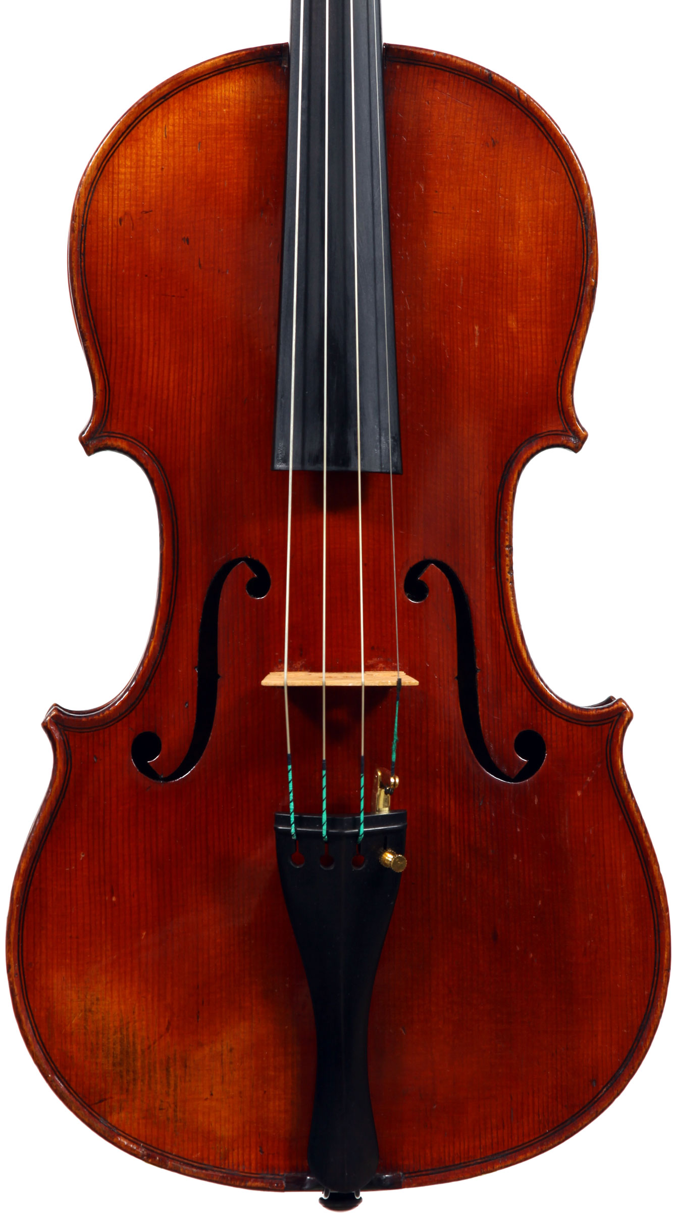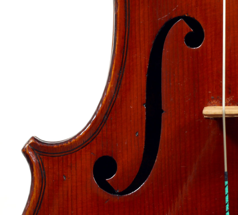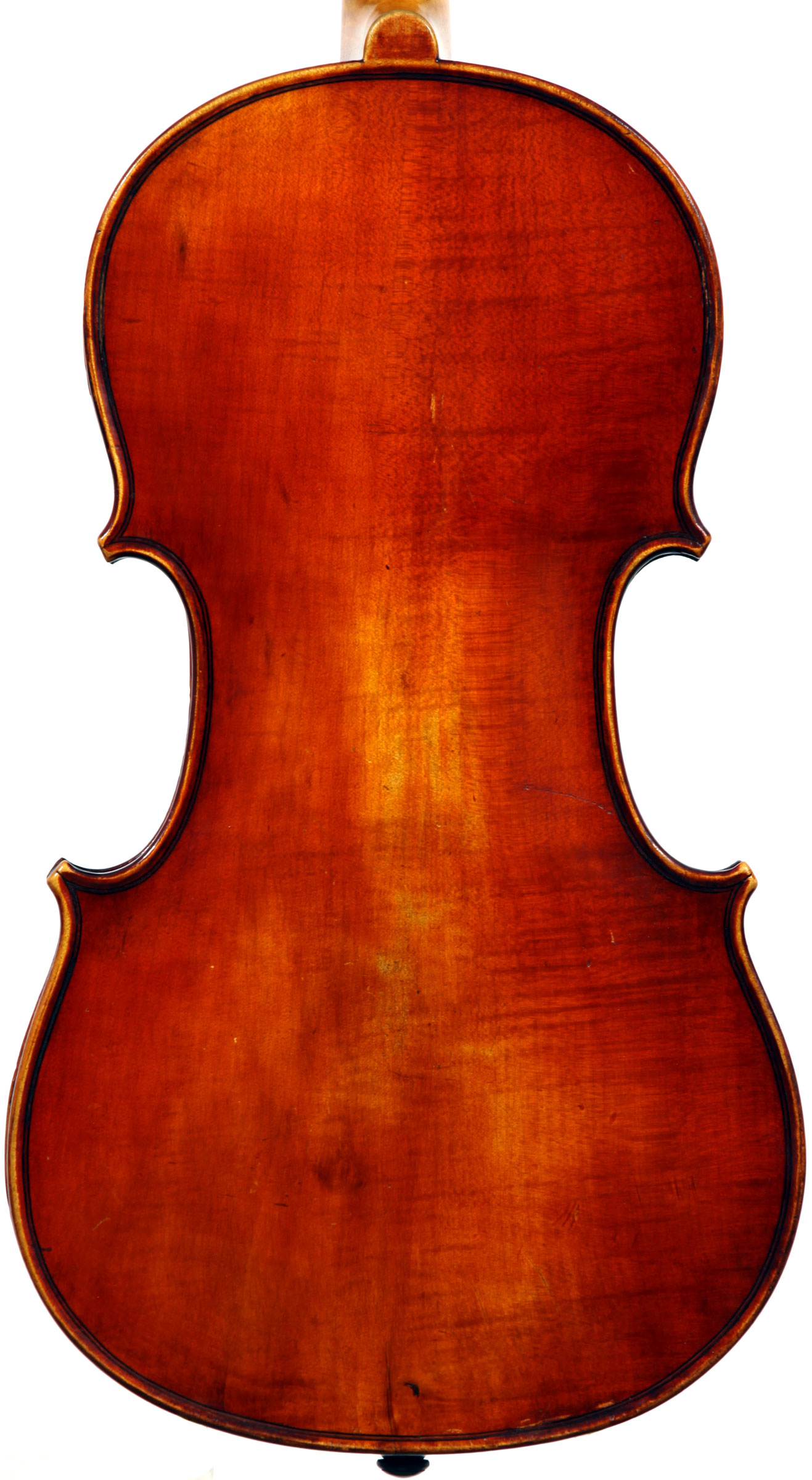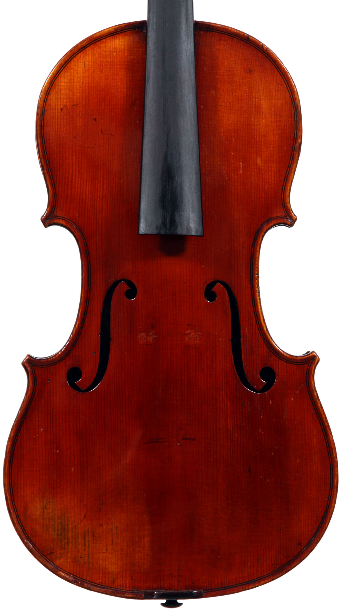 Although unlabelled, its French roots are apparent in the arching, cornerwork and varnish and also in the selection of materials. The top is of fairly open-grained spruce, often preferred by some Mirecourt makers. The attractive one-piece back and sides are of mildly figured maple with a faint curl. The varnish is a strong red-brown over a yellow ground which shows prominently and attractively where the varnish is worn - notably in the back. Workmanship is steady throughout.