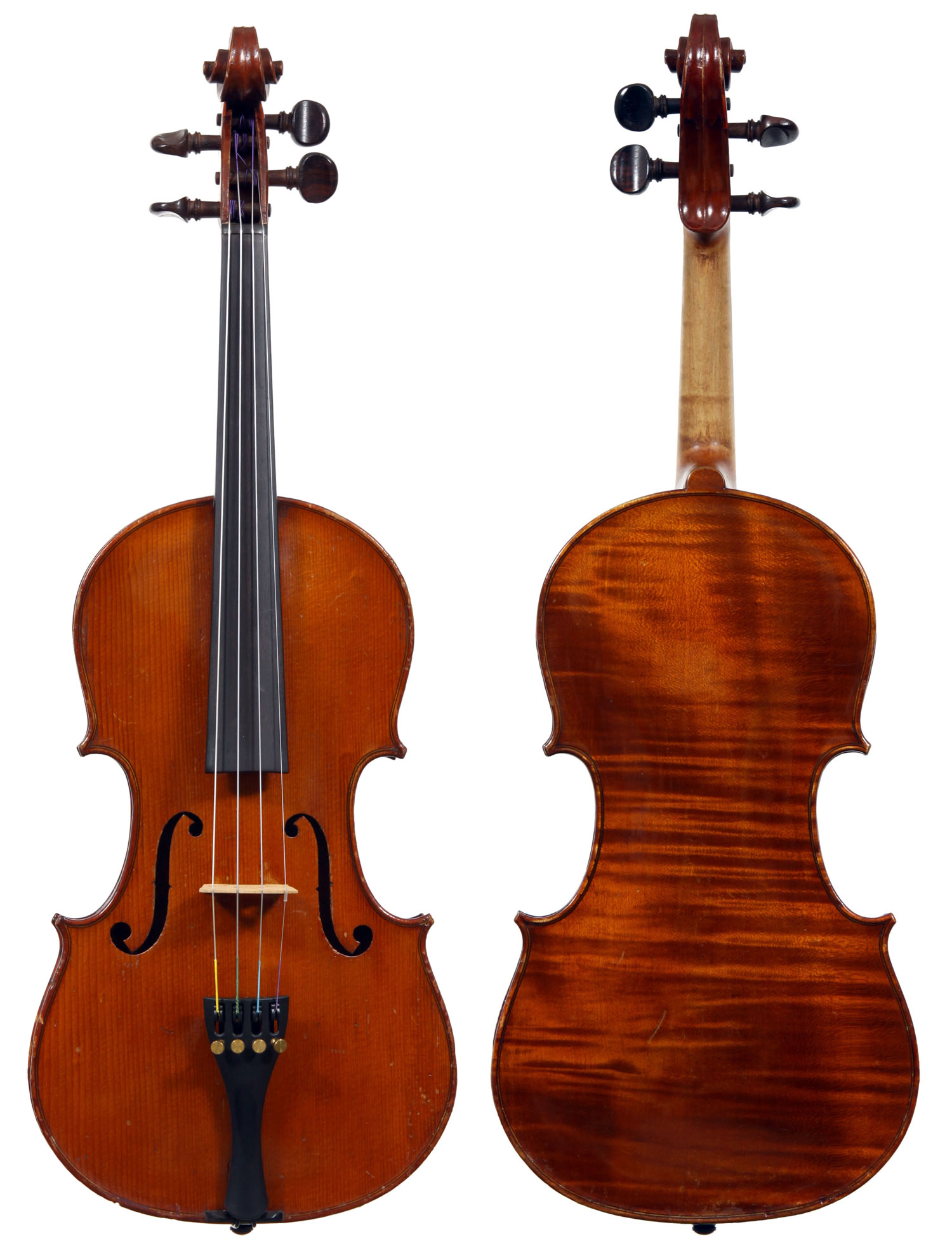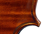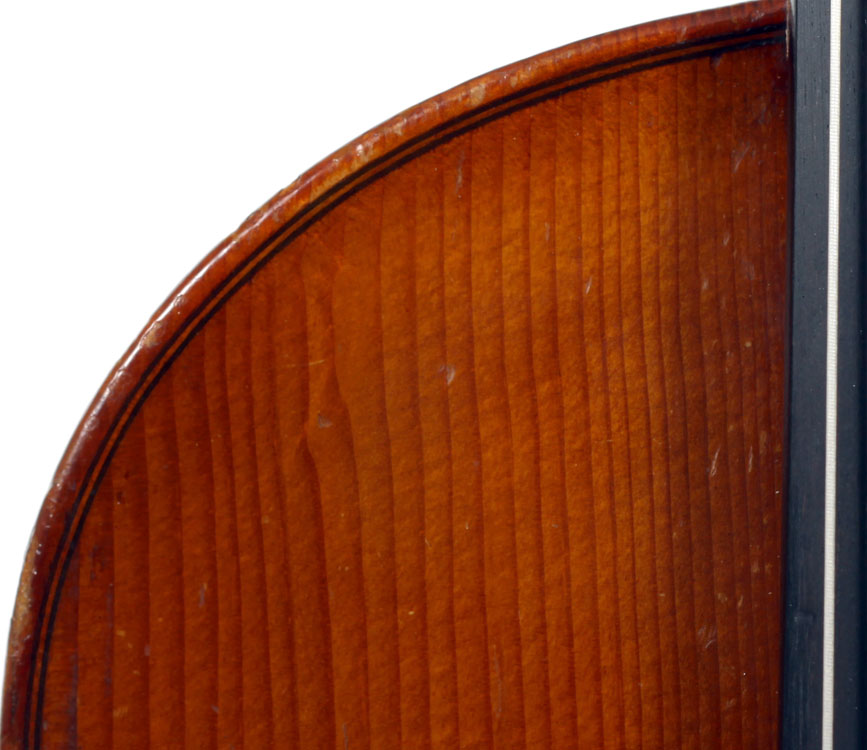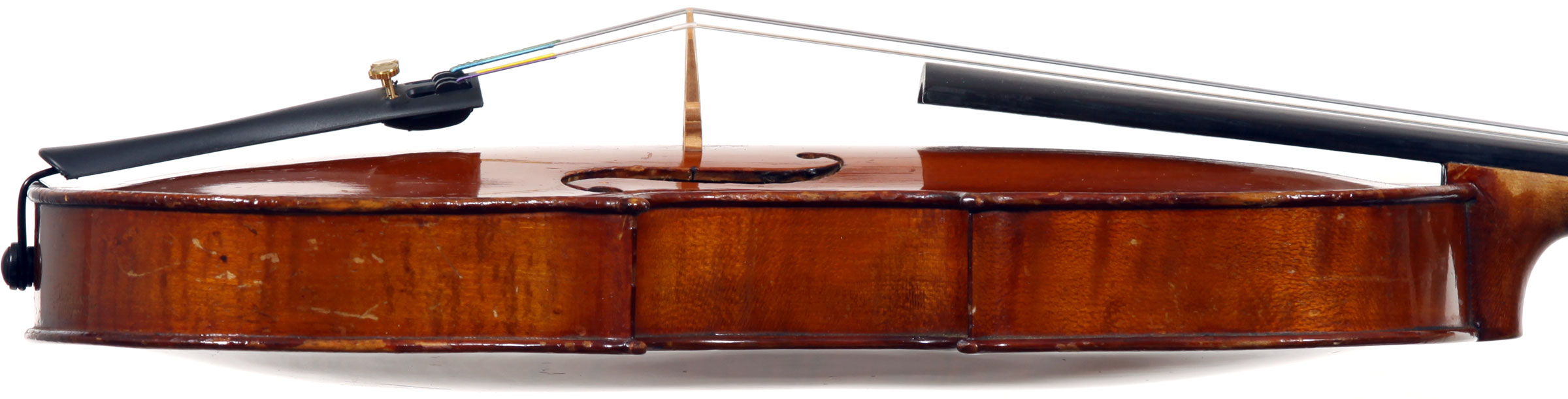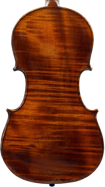 The first thing that strikes one visually is the beautiful nicely flamed one-piece back with a distinct and interesting irregular curl, repeated in the ribs. The top is of unusually open-grained tone spruce unmatched in the two halves. The golden-brown spirit varnish has some age-related character marks, typical in older instruments, but these have no structural implications. This violin is correctly blocked and lined inside with a fitted bass bar, nicely executed and which no doubt contributes to its tonal properties which are immediately apparent when playing it.