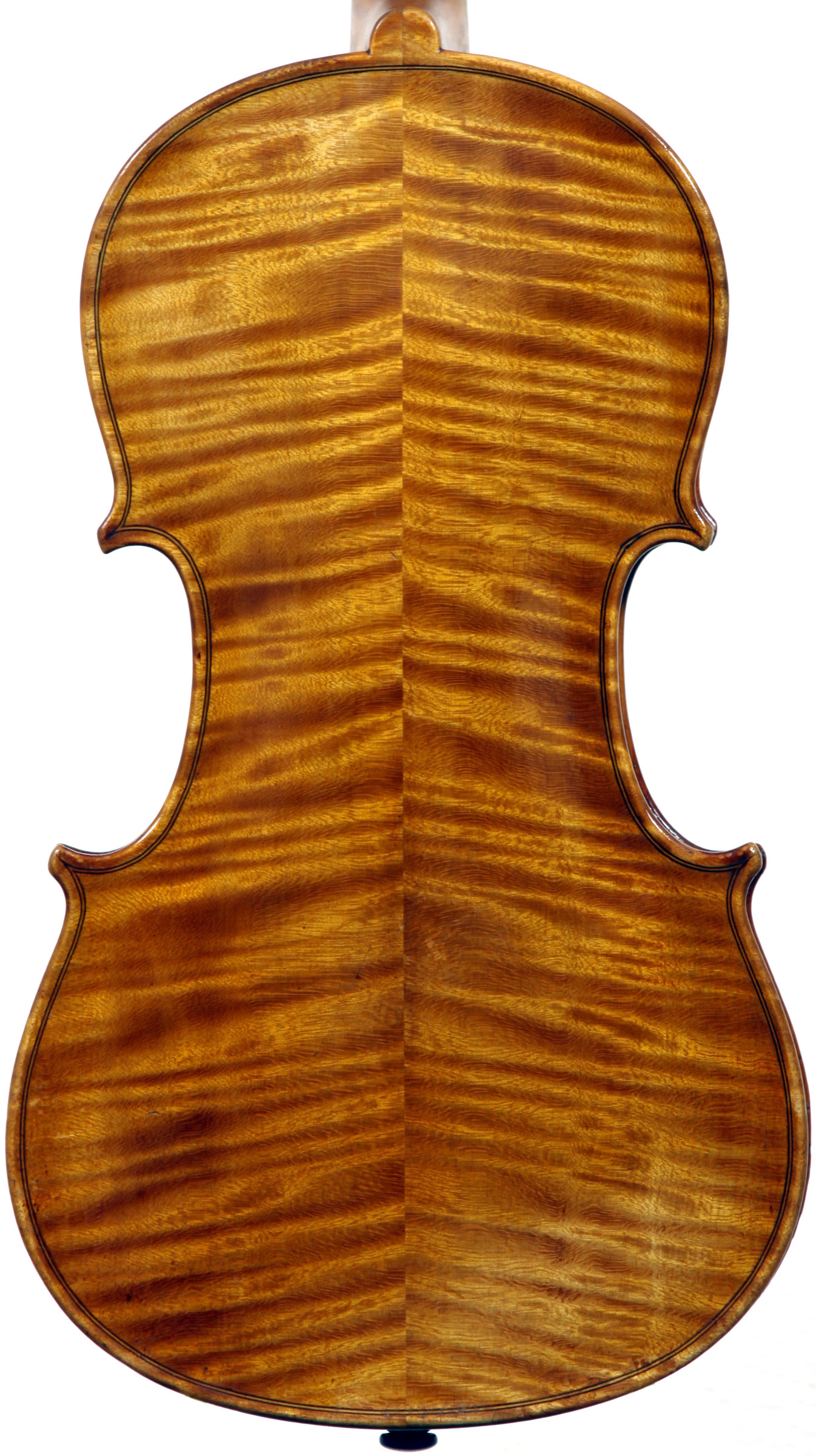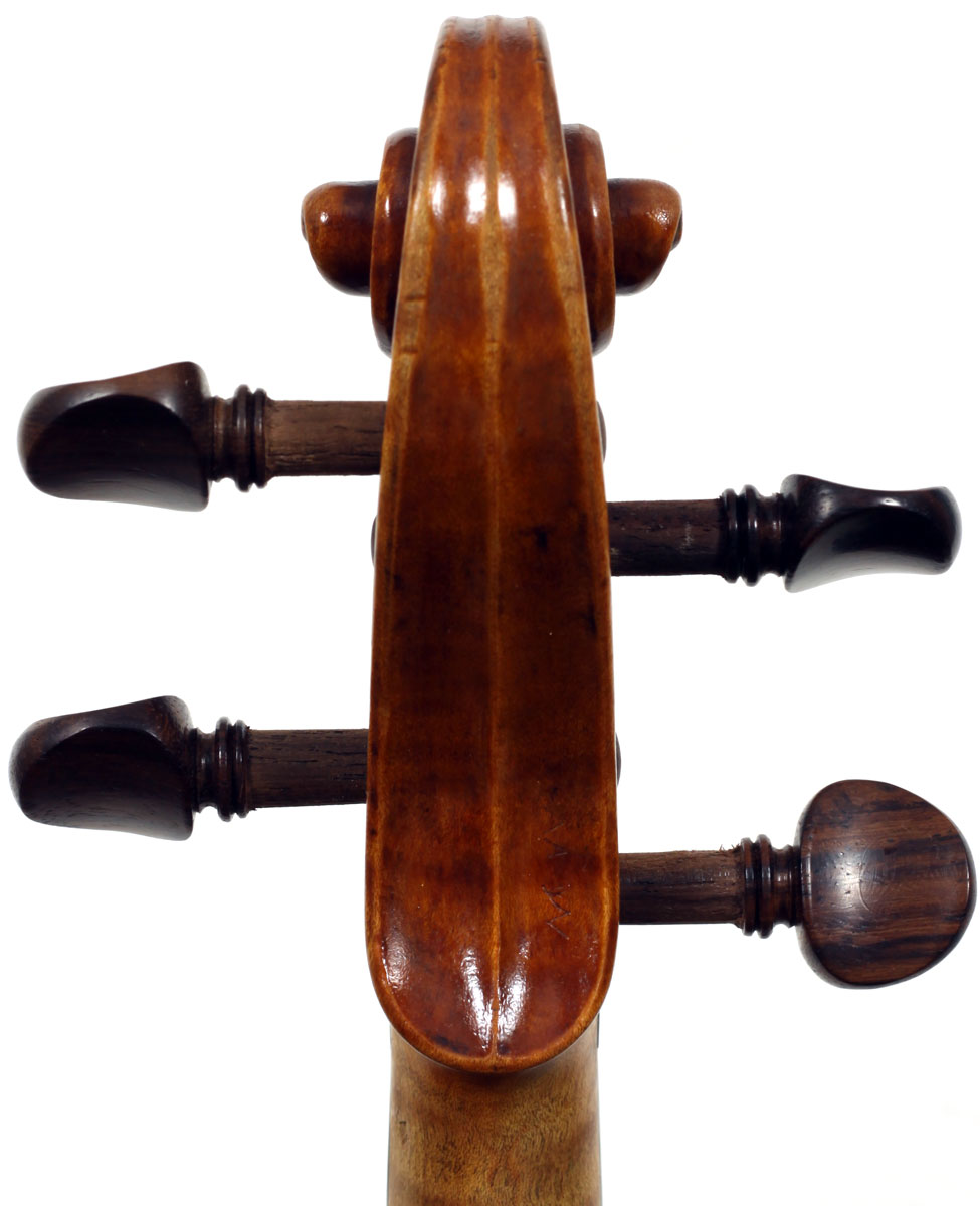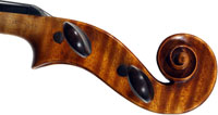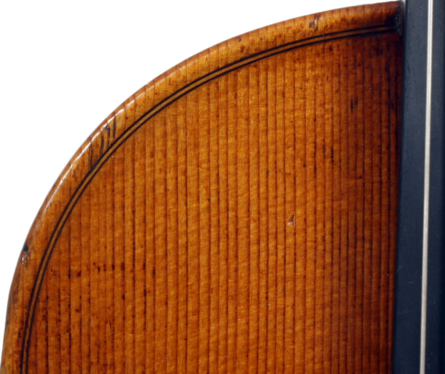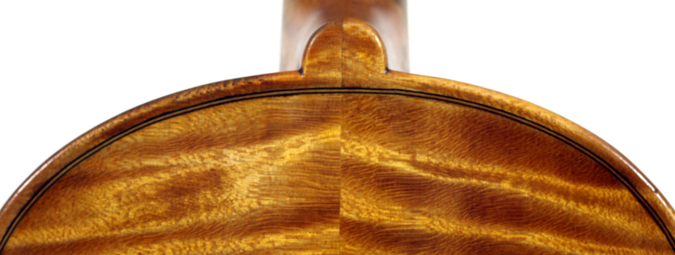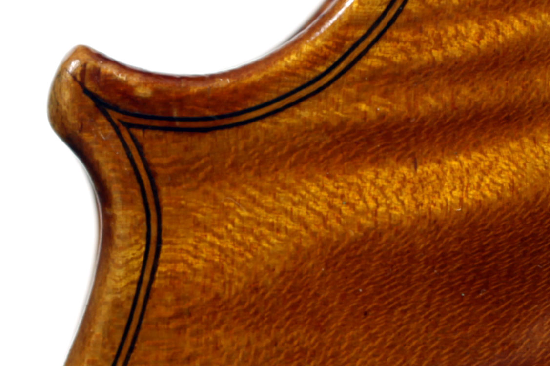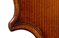 The selection of materials used for this violin shows discernment - the back and sides are of a maple with spectacular flame of medium to broad curl. The neck and scroll are less flamed but nevertheless very attractive. The top is of superb tone spruce with very even medium growth lines. The light golden-brown varnish is of high transparency allowing clear observation of the woods. Workmanship throughout is excellent, notably in the purfling and mitres. The scroll and Fs are balanced elegant adding to the overall appeal of a really attractive instrument.
