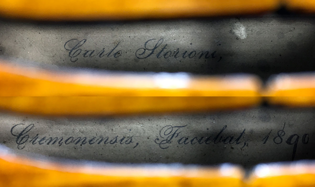 This violin is labelled as Carlo Storioni (see photo), made in 1890. This particular label, with its simple copperplate font and handwritten date, is specifically associated with a studio in Markneukirchen, Germany and it can be said confidently that this instrument has nothing to do with the Carlo Storioni who worked in Cremona in the first decade of the 19th century. This fact is confirmed by William Henley in his book in his famous reference book.