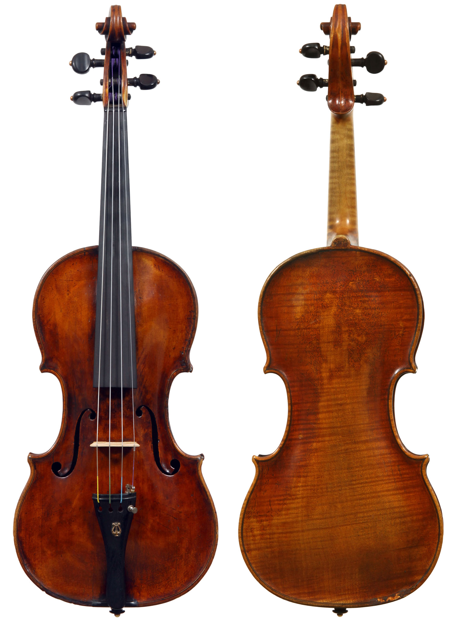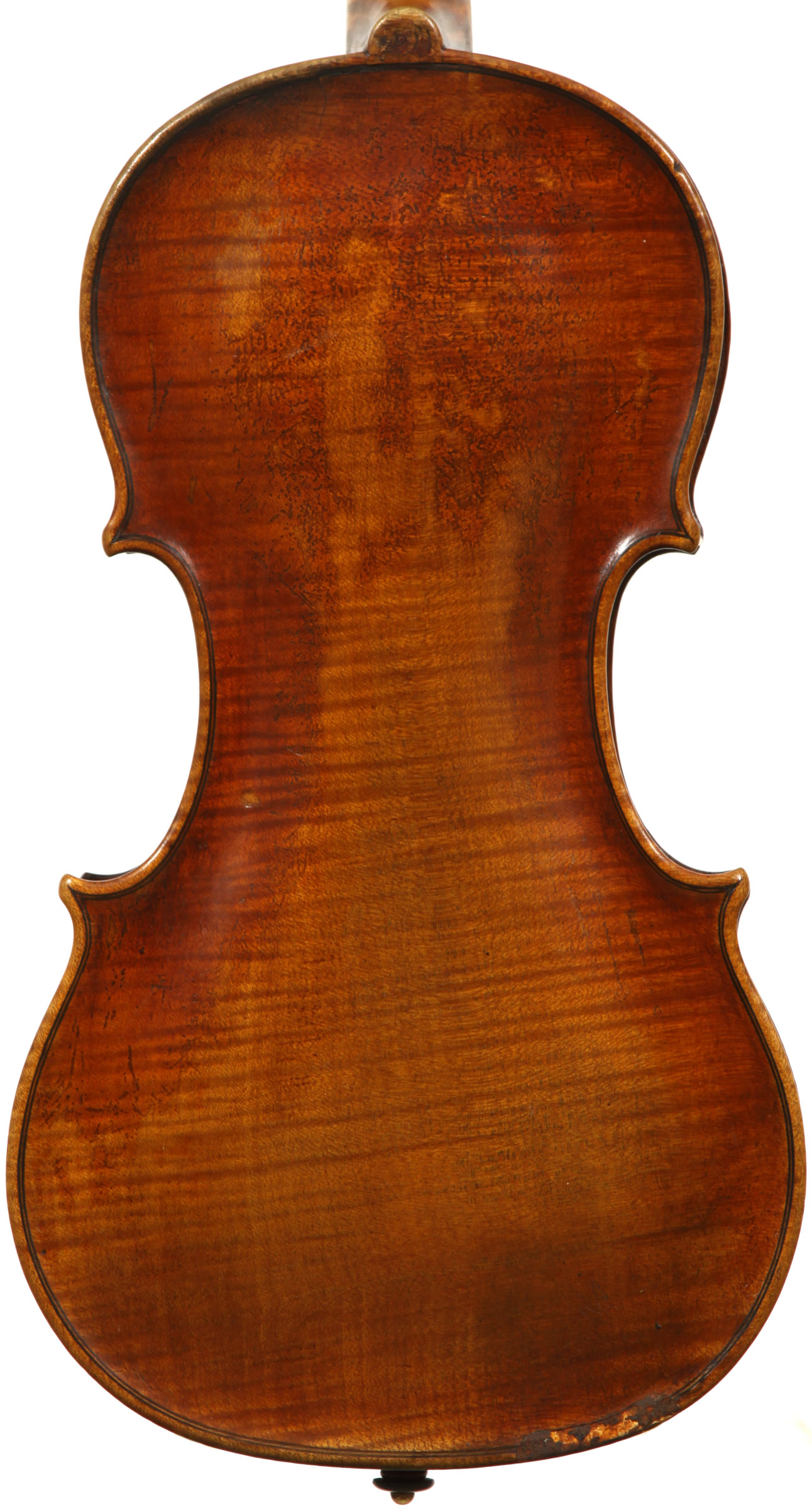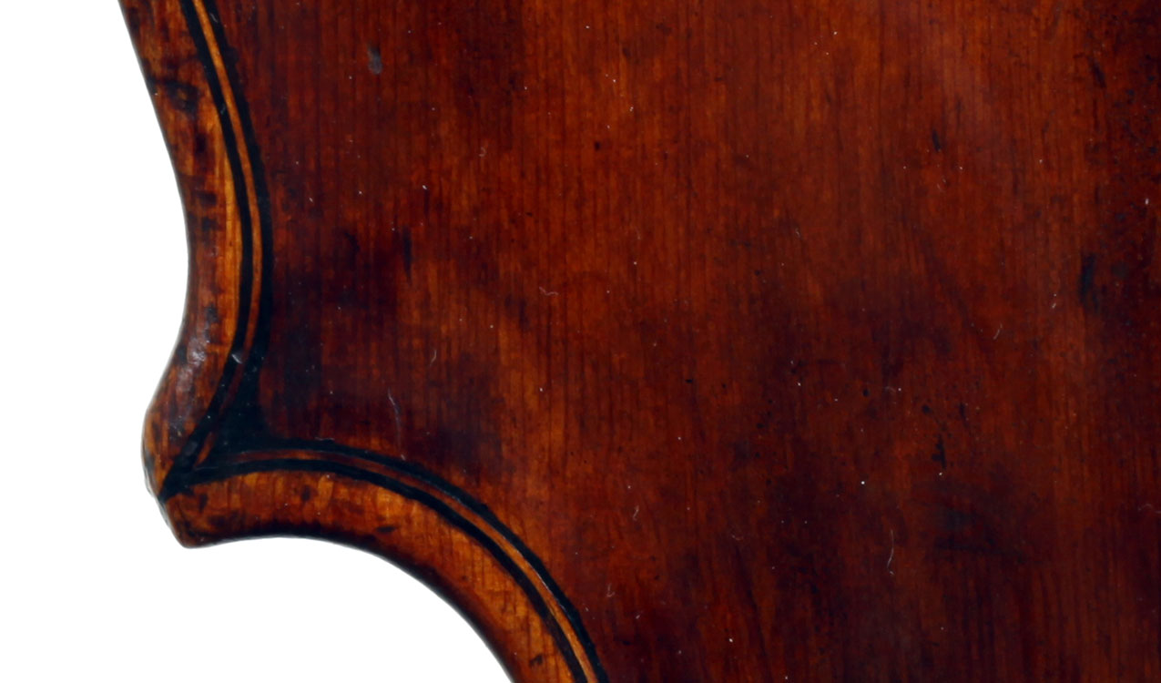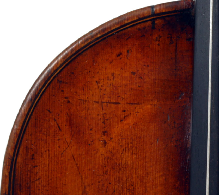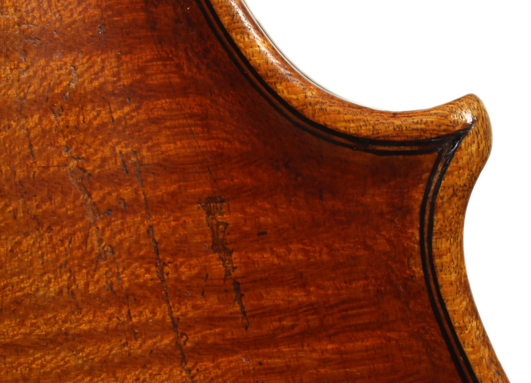 François Caussin l'ainé, (1794-1866) studied in Mirecourt under Charles Gaillard and established his own workshop in Rouvres-la-Chétive in 1815, where he remained active until 1865. He was a skilled copyist and understood the commercial advantages to be gained from copying and faking the work of the old masters. In his copies he went to the extent of selecting typical wood used by those makers. In the case of this violin, which is labelled Francesco Ruggieri, 1671 he selected a top of very finely grained tone spruce. The back is in one piece. The arching is quite deep, the purfling superb and the scroll elegant. The golden-brown varnish was antiqued considerably, particularly in the back, using the identical techniques seen in Caussin's other instruments. (Note that the pegs have been replaced since the photos were taken - the original golden caps were retrieved and fitted back into the new pegs.)
