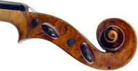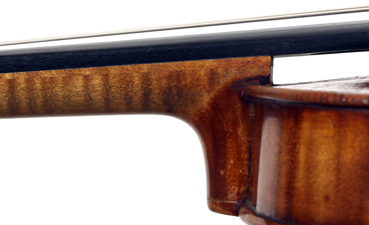 Although having been subjected to extensive restoration in its past, it can be said that this viola is structurally secure with no apparent hidden risk. The repairs carried out were the reinforcement of the pegbox flanks by means of three-layered plywood; the correction of the neck elevation by fitting a wedge under the fingerboard and the closing of the centre seam in the back, which evidently at some stage became loose. The seam appears to be secure, but the work could have been tidier in lining up the edged of the two halves. The varnish is worn in places due to much use, but this could easily be retouced by a qualified luthier. Also, other than two repaired wing cracks in the Fs, the viola is free from body cracks.