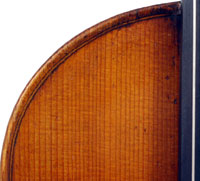 And it is visually appealing, having been made of very attractive materials. The two-piece back, ribs, neck and scroll appear to be of the same block of nicely figured wood - fine maple with a distinct, even narrow to medium curl - appealing to the eye. The top is of good tone spruce with a straight medium-grained winter growth. Workmanship is steady and good, but at times perfunctory, revealing traits normally associated with commercial work.