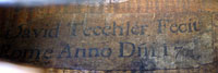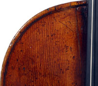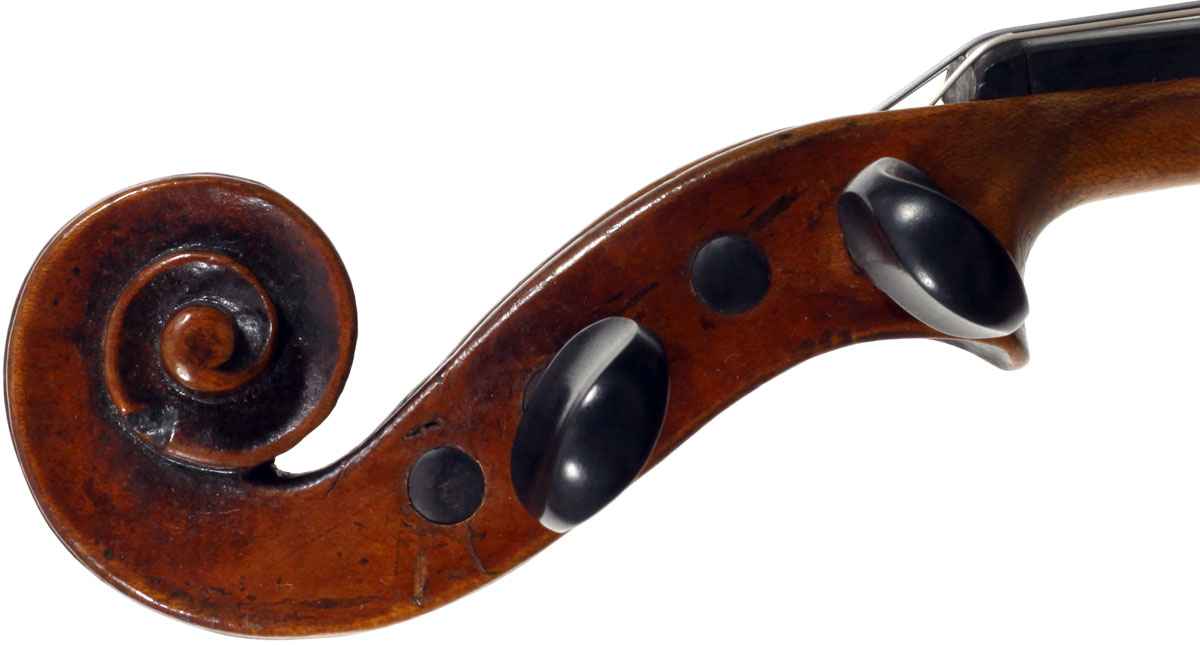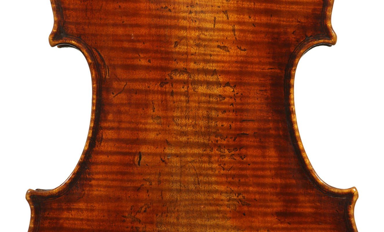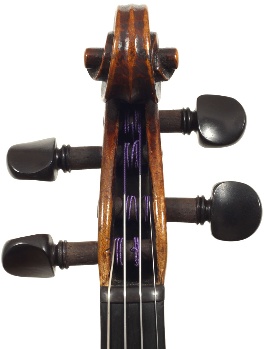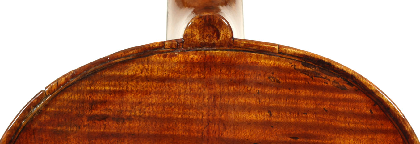 Although fitted with a very convincing David Tecchler label, this violin manifestly has nothing to do with that maker and almost certainly is a trade (commercial) instrument from around the mid-19th century. It is conceivable, under scrutiny, that this is a composite instrument, built around a very good back and ribs, but the top, neck and scroll having been added later. It appears that the purfling and mitres in the back are not only different, but also superior to that in the top.