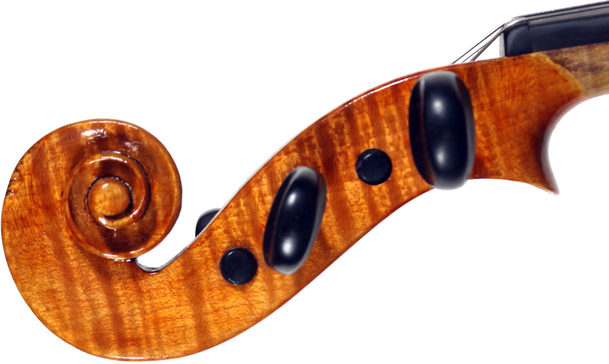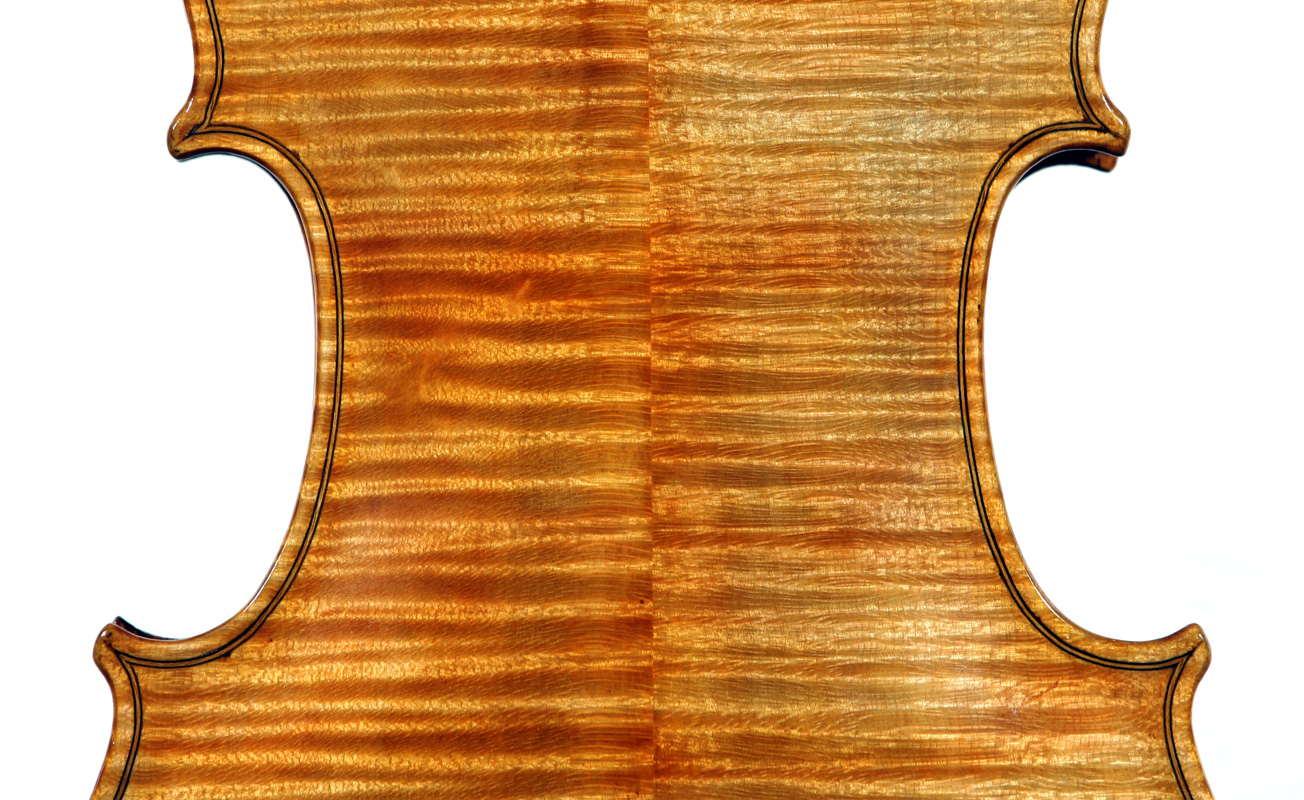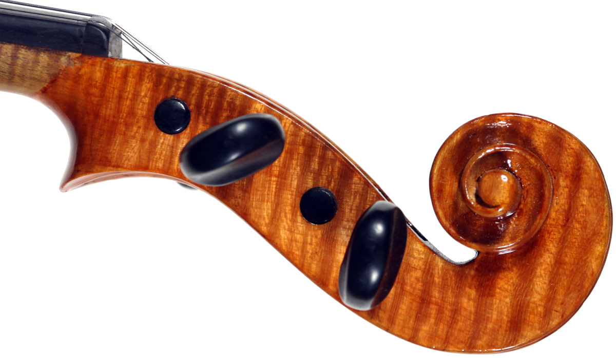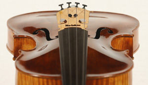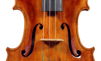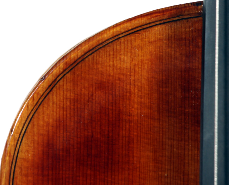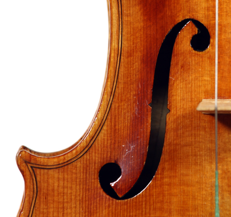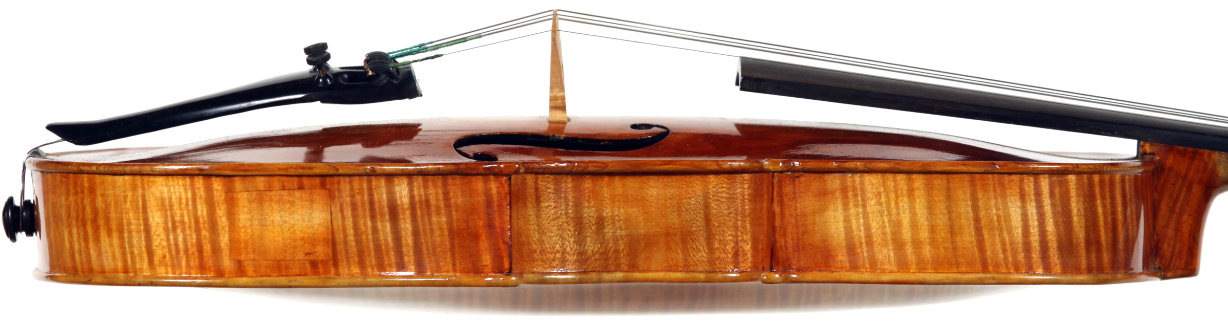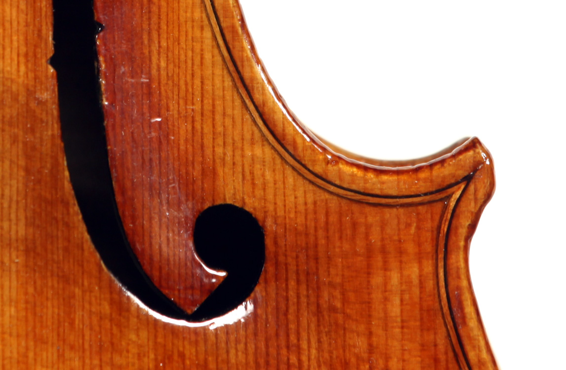 What impresses in this violin is the exceptional choice of materials - the two-piece back, ribs and scroll are of truly exquisite well-figured maple with a distinct straight medium to narrow curl, all ostensibly from the same piece of wood. The top is of excellent tone-spruce with a medium to narrow grain. The Fs are refined and the tracing of the purfling shows a steady and experienced hand - with superb mitres in the corners. The scroll is elegant and balanced.