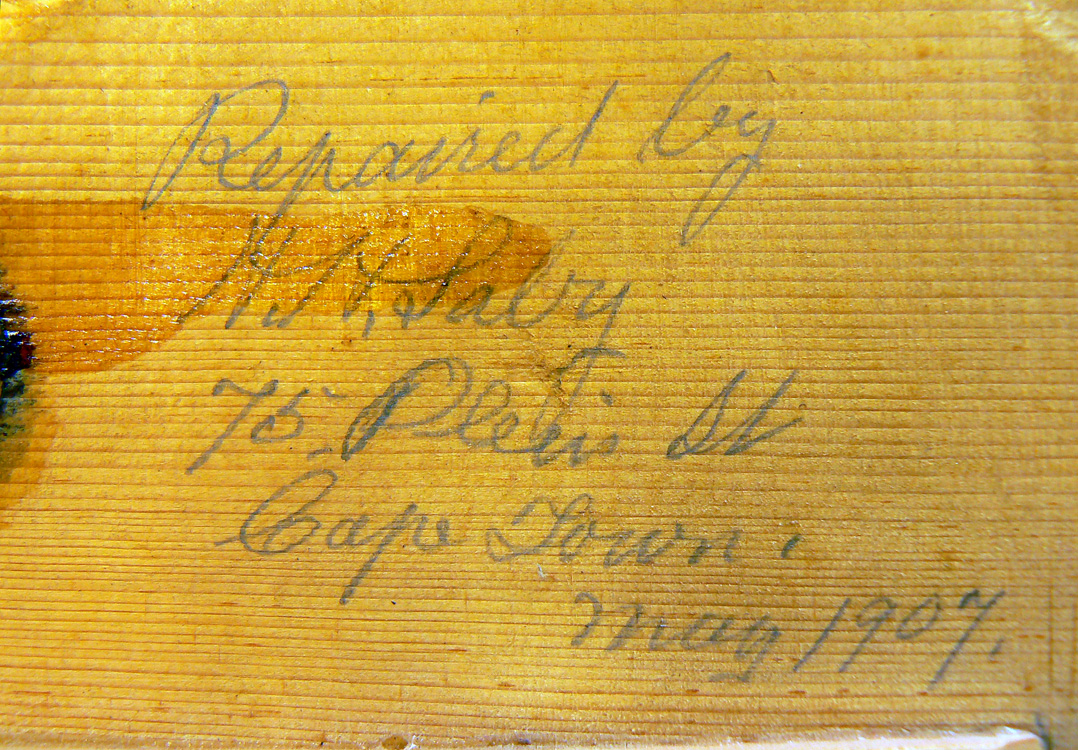 Furthermore, during a recent internal repair, when the top was removed, a repair inscription was found written in the top to the effect that the violin was repaired by H. H. Saby in Cape Town in May 1907, apparently to repair damage to the lower treble rib. (See photos.) Saby was an important English violin maker during the Victorian era and settled in Cape Town where he was greatly respected for work in violin restoration. This also means that this violin is much older than it looks, probably having been made around 1900 or earlier and was in very good hands at that time.